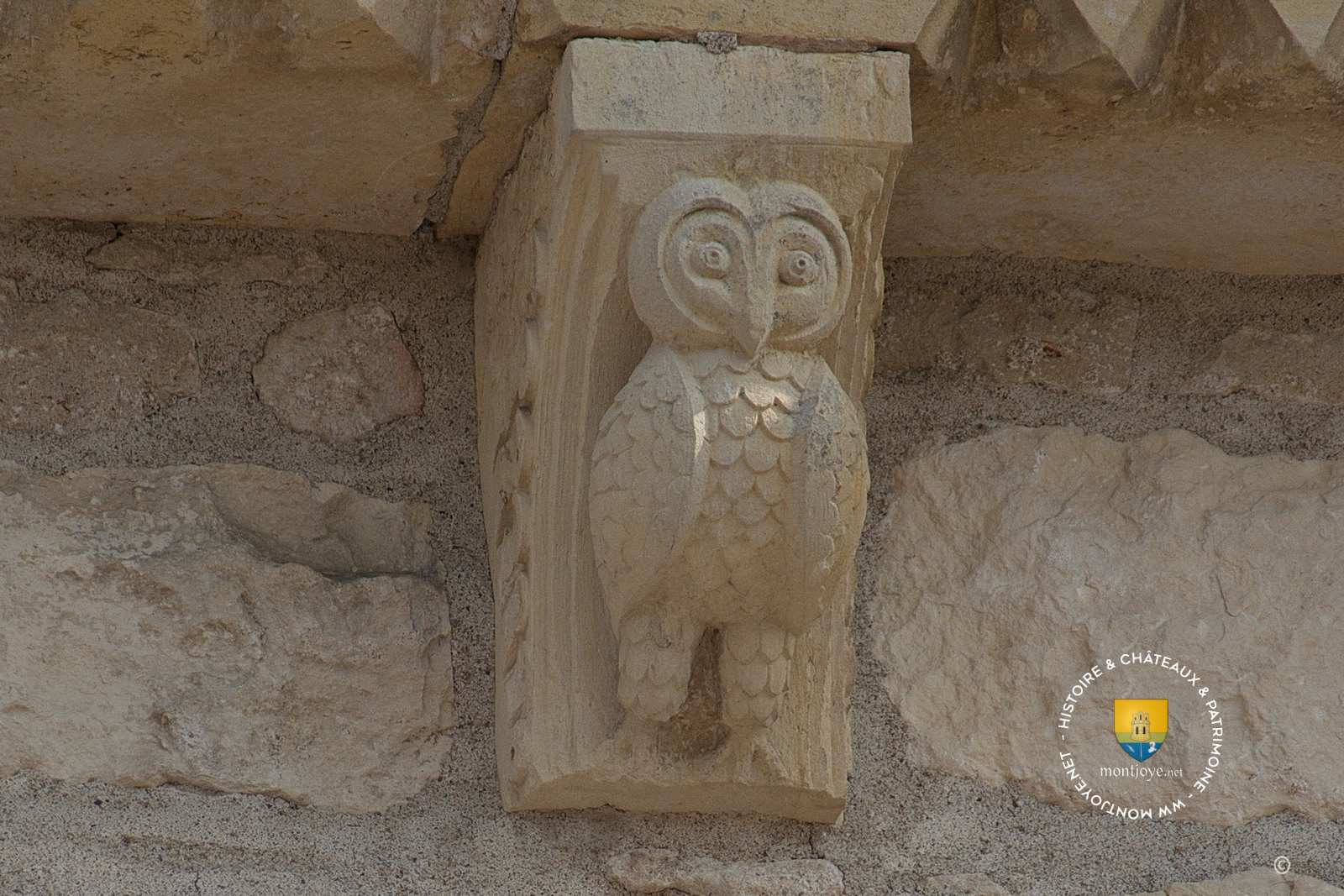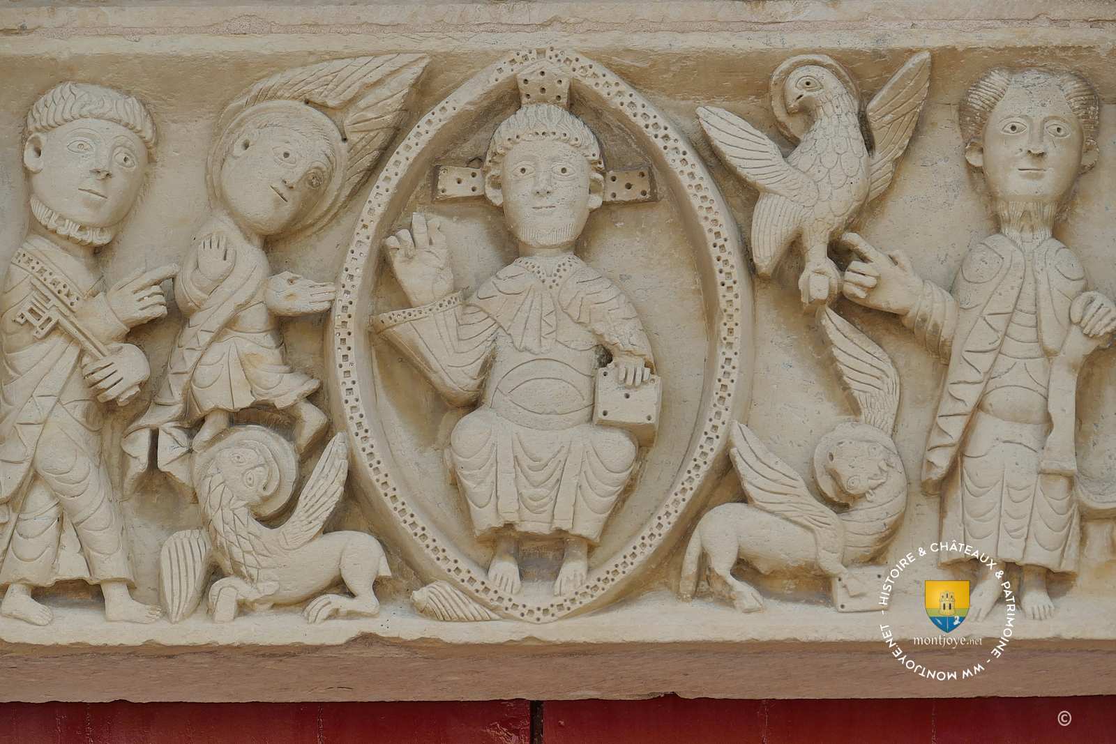 Nous ne pouvons passer sous silence le portail en saillie et le triple voussoir surmontant les colonnes qui flanquent les pied-droit de la porte. Le tympan mérite d'être étudié : c'est le Sauveur bénissant. Il est placé dans une auréole ovoïde avec une croix épaisse sans nimbe qui orne sa tête; les quatre animaux symboliques sont disposés autour de lui suivant la place hiérarchique qui leur est attribuée dans l'iconographie chrétienne ; puis trois apôtres sont placés de chaque côté. On distingue facilement saint Pierre, le premier de ceux qui occupent la droite du Christ; le premier de gauche, tenant un phylactère déroulé, est probablement saint Paul. Tous ces personnages reproduisent les formes byzantines, soit dans l'agencement de leurs vêtements, soit dans leur pose et la coupe de leurs cheveux.