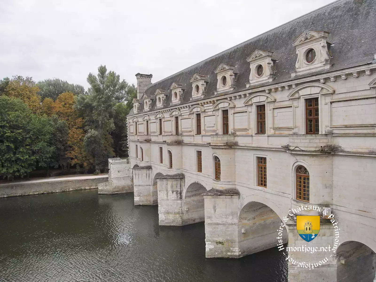 Reine et mère des rois : François II, Charles IX et Henri III. Elle aime les fastes, et dans ce but, fait édifier à Chenonceau deux galeries superposées sur le pont de Philibert Delorme, il est probable par ailleurs qu'il en soit l'architecte puisque le devis initial en faisait parti cependant c'est Bullant qui finira le travail tout comme aux Tuileries. La galerie principale sur le pont servait de salle de Bal et fut inaugurée en 1577 lors des fêtes données par Catherine de Médicis et son fils Henri III. Cette conception est unique au monde. La chambre de la reine était accessible par un petit passage vers la Galerie. À chaque extrémité de la Galerie, se trouve deux belles cheminées de la Renaissance, l'une des deux comporte un décor cachant une porte qui menait à la rive gauche du Cher. Les médaillons sont du XVIIIe siècle et représentent divers personnages célèbres de l'époque.