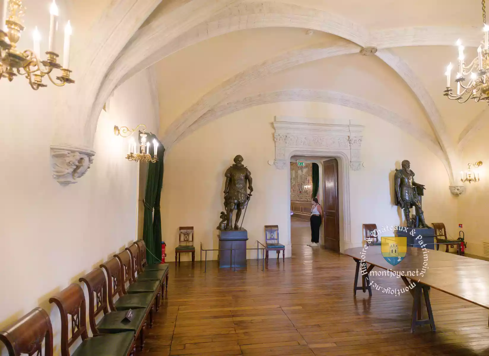 Il est plus remarquable encore que l’extérieur. C’est un véritable musée du plus haut intérêt pour l’histoire et pour l’art. Traversons rapidement, au rez-de-chaussée : le salon d’attente et la salle à manger des Princes; nous voici dans la grande salle, où se réunissaient jadis les États de Béarn. La statue d’Henri IV, par Francheville, se dresse au fond de la salle. Rien n’est plus magnifique que les tapisseries des Flandres qui garnissent les murs. Elles ornaient, sous François Ier, le fameux château de Madrid, construit par ce prince au bois de Boulogne. Elles représentent des scènes de chasse. Le grand escalier, qui va nous conduire aux étages supérieurs, est large de deux mètres soixante-cinq. Les voûtes de chaque palier varient de forme; elles offrent successivement l’arc ogival, l’arc en plein cintre et l’arc surbaissé. Les chiffres enlacés d’Henri IV et de Marguerite de Valois, restaurateurs du château, se voient partout dans les frises. Le premier étage du château présente d’abord le petit salon, tendu de riches tapisseries des Gobe- lins représentant les principaux faits de la vie de Henri IV; puis viennent : le salon Bernadotte (cheminée en porphyre vert, don du roi de Suède Charles- Jean; tapisseries des Gobelins du dix-septième siècle, provenant du palais de Versailles); la chapelle, moderne (1843), mais conservant incrustée dans ses parois une inscription ancienne relative à Gaston- Phœbus; une antichambre, le grand salon de réception, dont les splendides tapisseries, comme celles de la salle des Etats, proviennent du château de Madrid et figurent des compositions allégoriques sur les mois; le salon de famille (table en porphyre rose de Suède, donnée par le roi Charles-Jean; statue en bronze de Henri IY enfant, d’après Bosio); la chambre des rois de Navarre, tendue de tapisseries des Gobelins et garnie d’admirables meubles du seizième siècle. On passe encore par une série de pièces luxueusement restaurées avant de monter au second étage, et l’on visite successivement : la chambre de Jeanne d’Albret, dont le lit authentique en bois sculpté porte le millésime de 1562 ; le cabinet de la reine et la chambre à coucher de Henri IV, on voit encore la carapace de tortue qui servit de berceau au futur roi de France et de Navarre. Nous n’avons signalé que les principaux appartements ; ceux que l’on parcourt encore ne sont en rien comparables à ceux que nous avons cités.