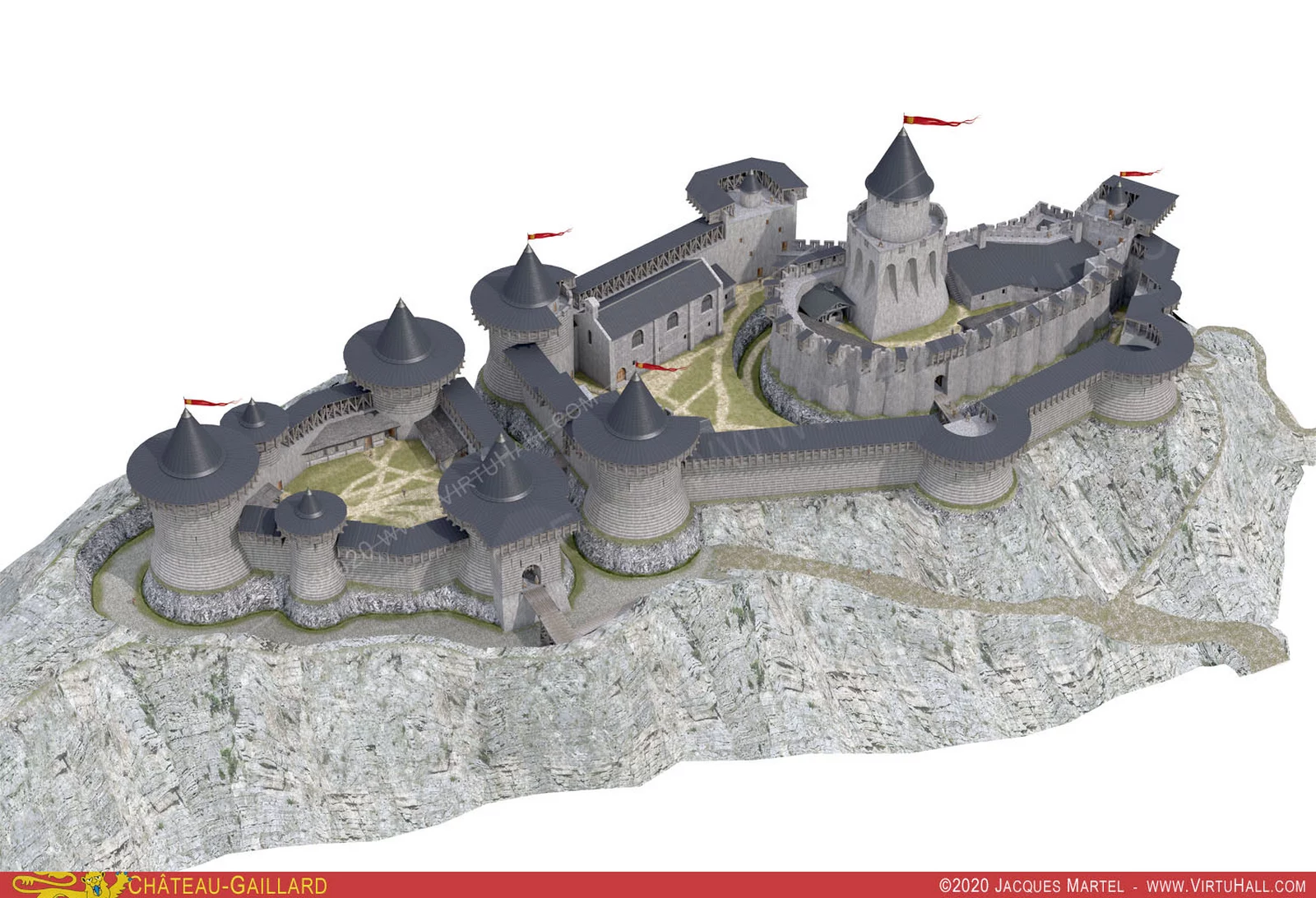 Il ne fallait donc pas trop séparer Château-Gaillard de la Seine, puisqu’il assurait également l’œil de la boucle de la Seine. Par ailleurs le château n’était pas seul sur la colline, c’est un ensemble homogène défensif prévu en grande partie dès la construction du château. Sur le plateau, existe un groupement d’avant-postes et de places fortes sur mottes. La vallée possédait déjà une défense naturelle efficace via des marécages, entourés des bourgs fortifiés des Andelys. Sur l’autre rive et sur l’île, un ensemble de fortifications et de pièges pour tout navire voulant descendre ou remonter la Seine sans l’aval du château. L’objectif était donc de cloisonner efficacement l’ensemble des routes fluviales ou terrestres menant principalement vers Rouen.