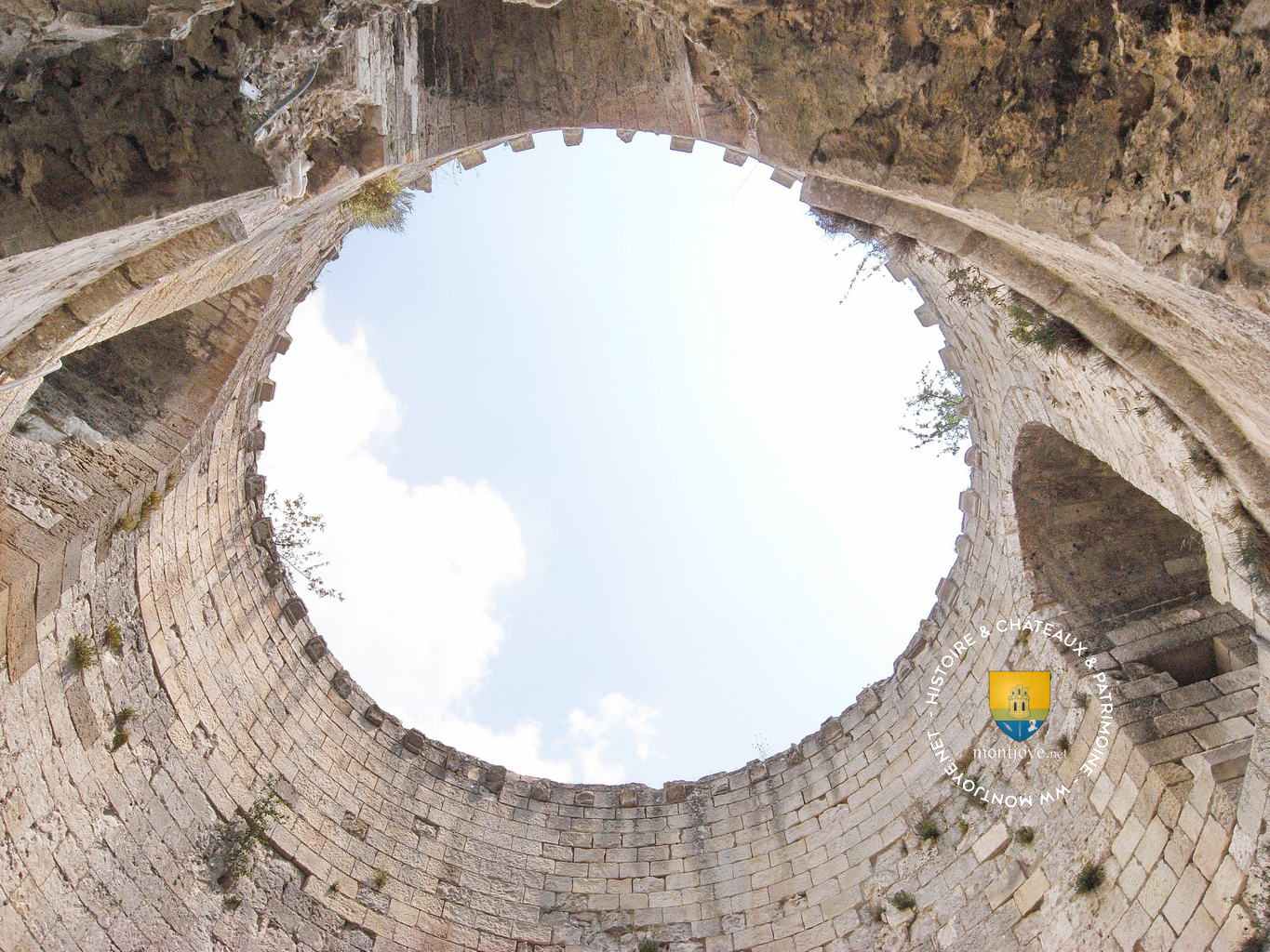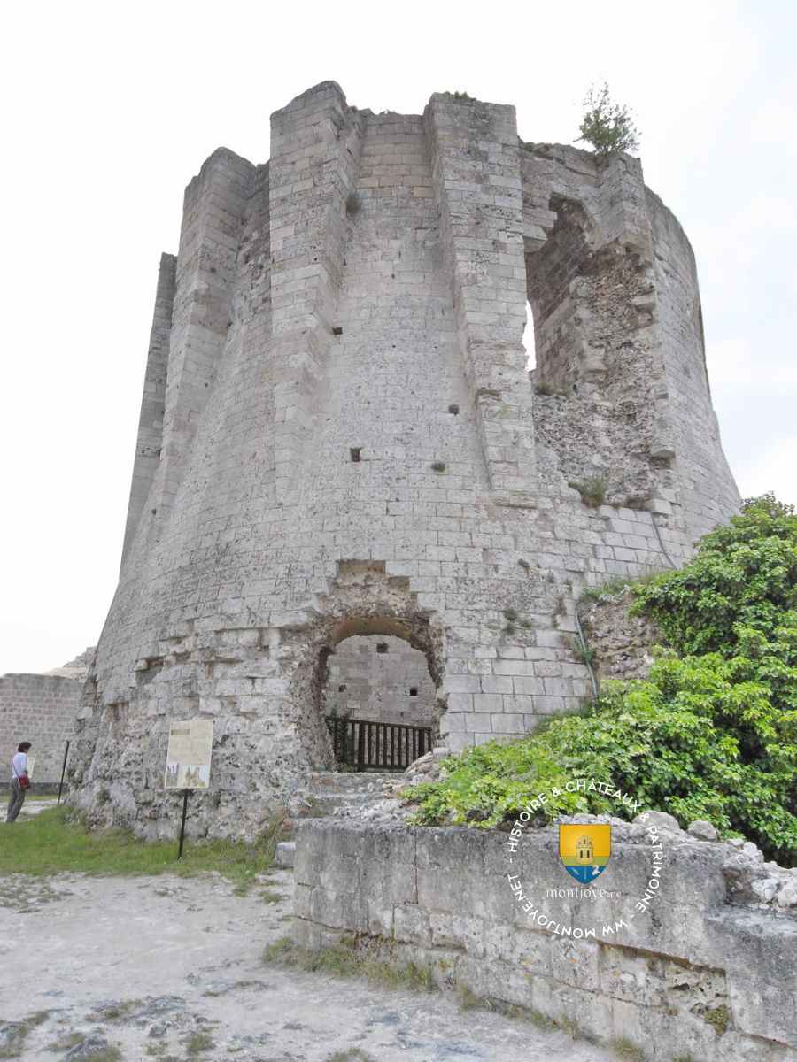 Le donjon, dont le pied est entièrement plein et par conséquent à l'abri de la sape, se composait d'une salle ronde à rez-de-chaussée, de laquelle il fallait descendre, d'un premier étage au niveau de la poterne P, d'un second étage au niveau des mâchicoulis avec chemin de ronde crènelé, d'un troisième étage en retraite, fermé, propre aux approvisionnements de projectiles, et d'un quatrième étage crènelé et couvert, commandant le chemin de ronde et les dehors au loin ( vue 1 ).