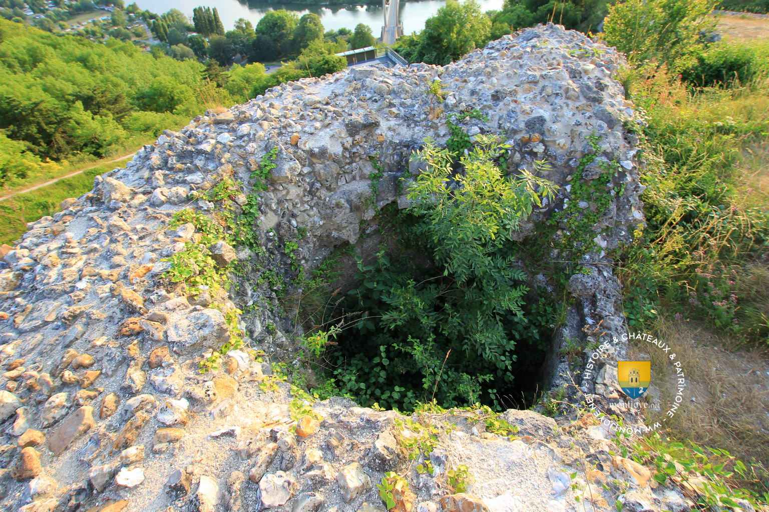 Du côté de l'escarpement abrupt D, qui domine le cours de la Seine (vue 2), les mâchicoulis étaient inutiles, car il n'était pas possible à des assaillants de se présenter sur ce point; aussi Richard n'en fit point établir. À l'intérieur, les divers étages n'étaient en communication entre eux qu'au moyen d'escaliers de bois traversant les planchers. Ainsi, dans ce donjon, rien de trop, rien d'inutile, rien que ce qui est absolument nécessaire à la défense. »