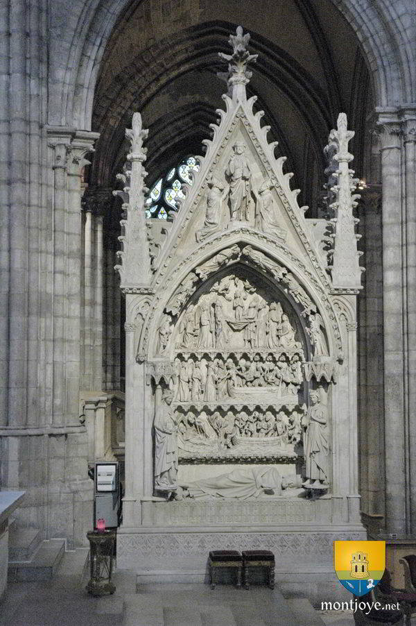 En pierre calcaire, aujourd'hui totalement blanc, il était à l'origine en polychromie. Les trois registres sculptés du tombeau représentent le récit de la vision de l’ermite Jean. Néanmoins si les moines lui rendirent hommage par ce monument, ils n'ont pas hésité à y mettre plusieurs messages assez ambivalents, par exemple l'âme du roi est figurée par un enfant nu et couronné qui est amené vers l'enfer, notamment par rapport au fait qu'il avait disposé à plusieurs reprises des biens de l'église. Puis au niveau supérieur, se trouve Saint-Denis, Saint-Martin et Saint-Maurice qui le retiennent et l'enlève des démons de l'âme, puis présenté au ciel et au Paradis.