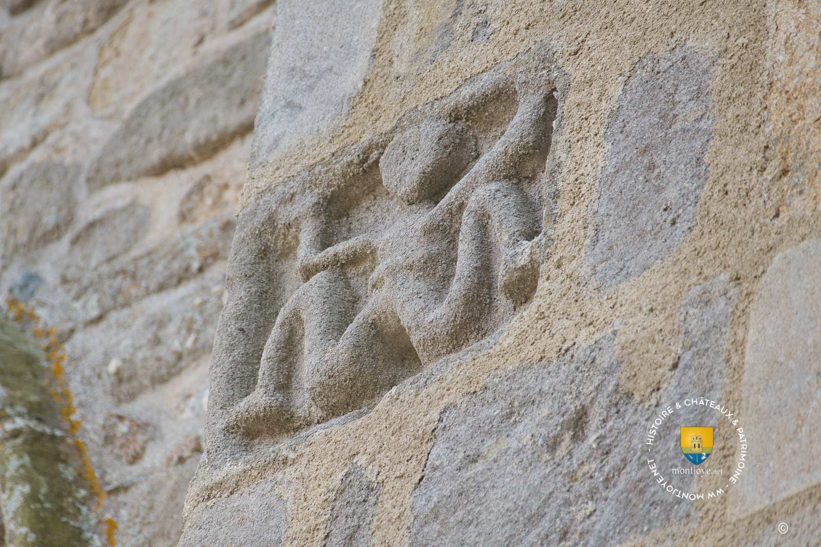 De belle représentations sur la face nord du clocher : une sirène à deux queues et sur une pierre d'angle se trouve un " basilic" qui représente le Mal et une tête aux yeux baissés tenue dans ses mains.