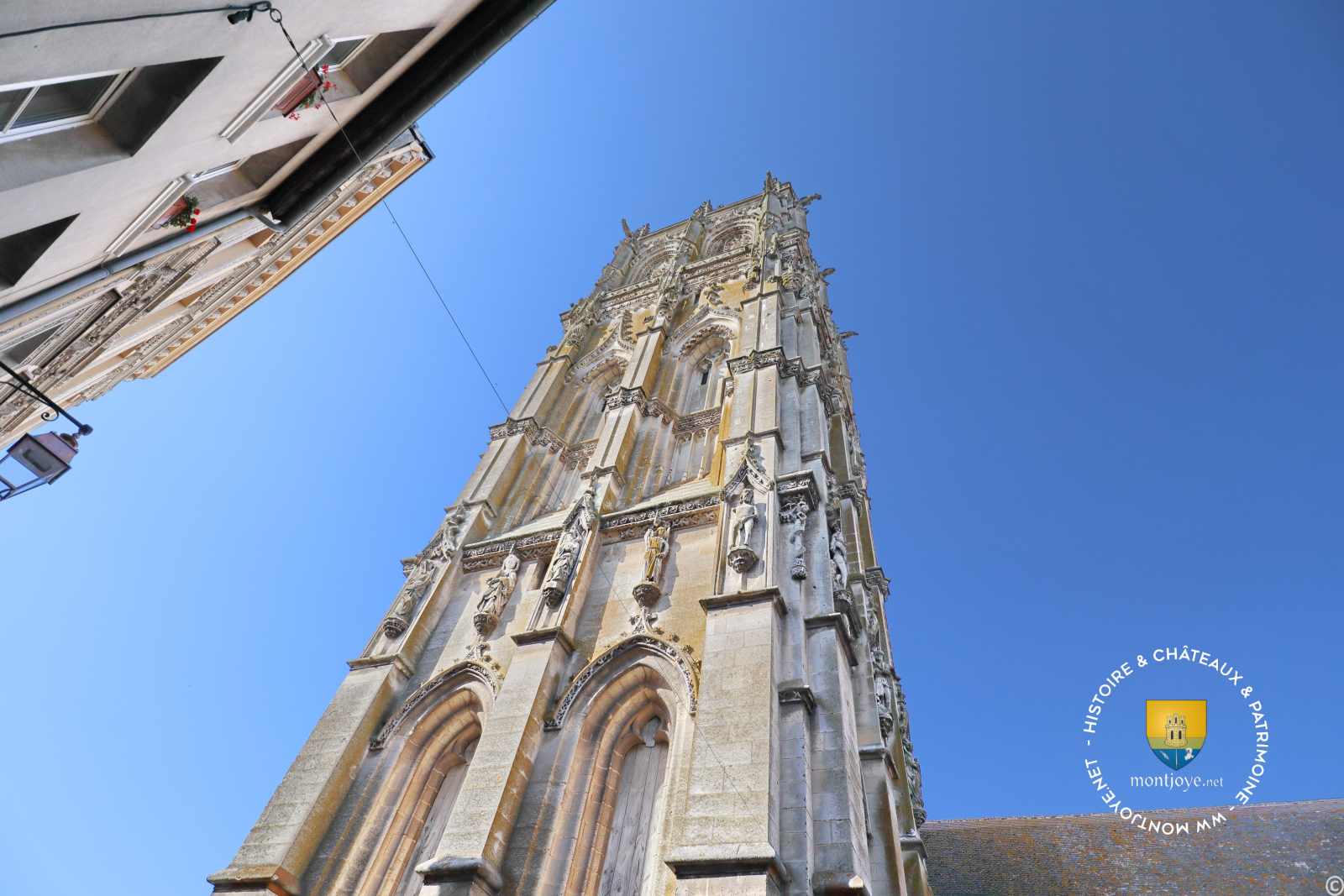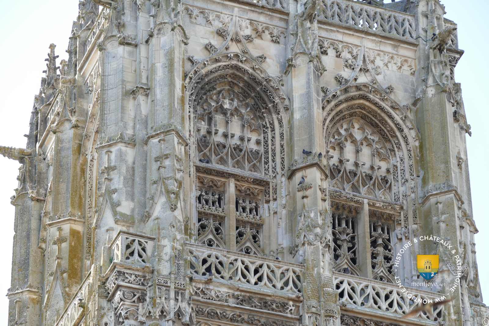 1465-1526, construction de la tour actuelle, avec une base en gros blocs de grès. Elle fut terminée grâce à la générosité de Artus Fillon, curé de Saint-Maclou dans la ville de Rouen qui deviendra évêque de Senlis. Elle fait une hauteur de 56 mètres et semble se rapprocher de la Tour de Beurre de la Cathédrale de Rouen notamment par ses riches décorations.
