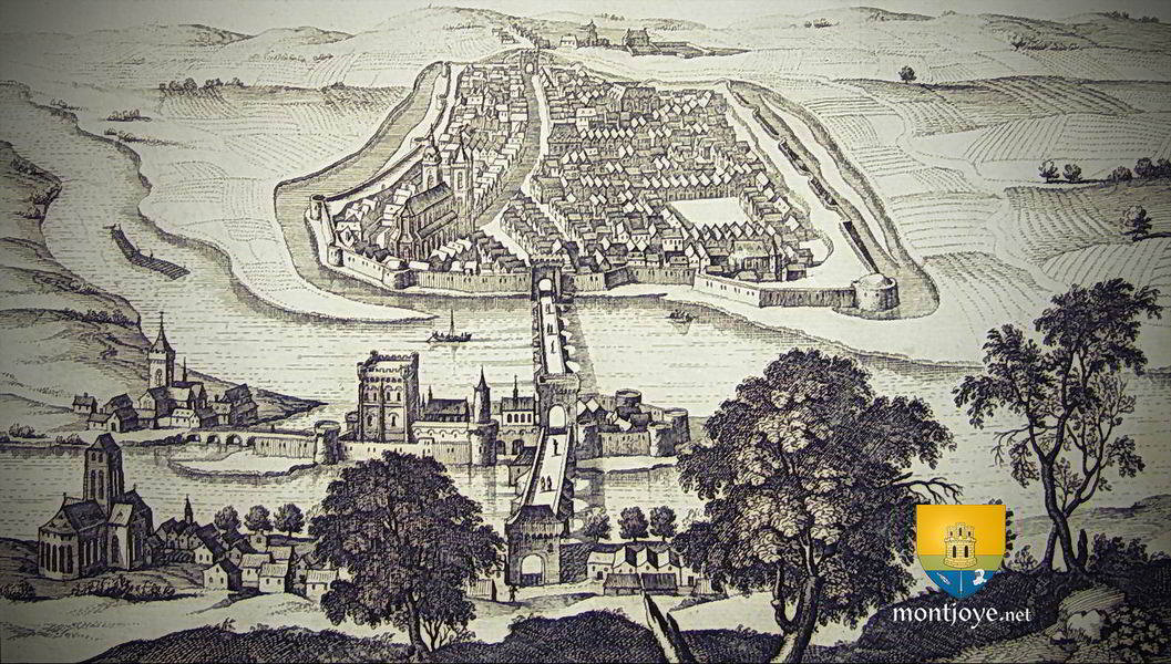 Pont de Montereau en 1660, vu de Surville, on voit nettement le château au centre. La rencontre entre le dauphin et Jean sans Peur s'est passée au centre à côté de la deuxième porte du pont.