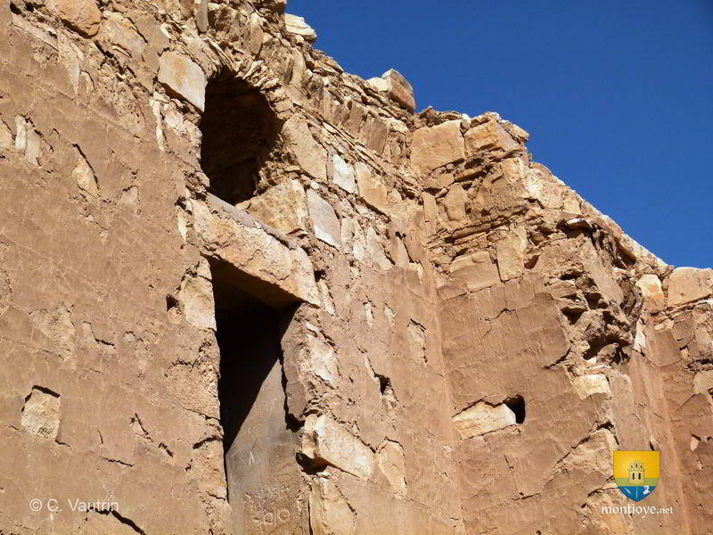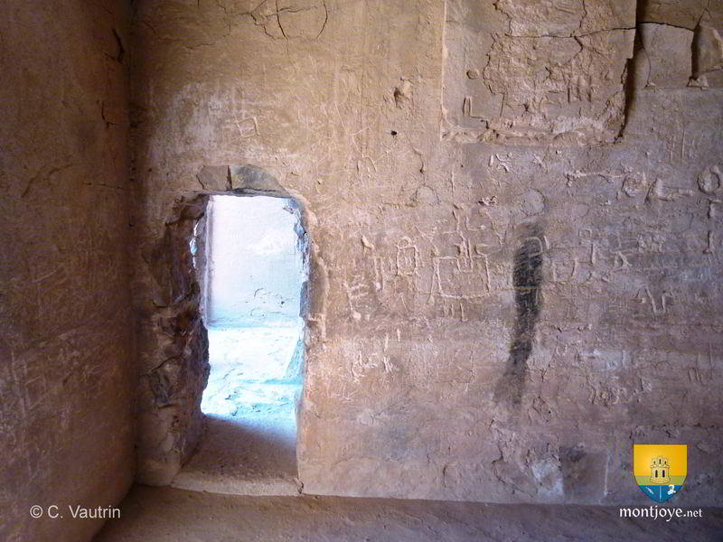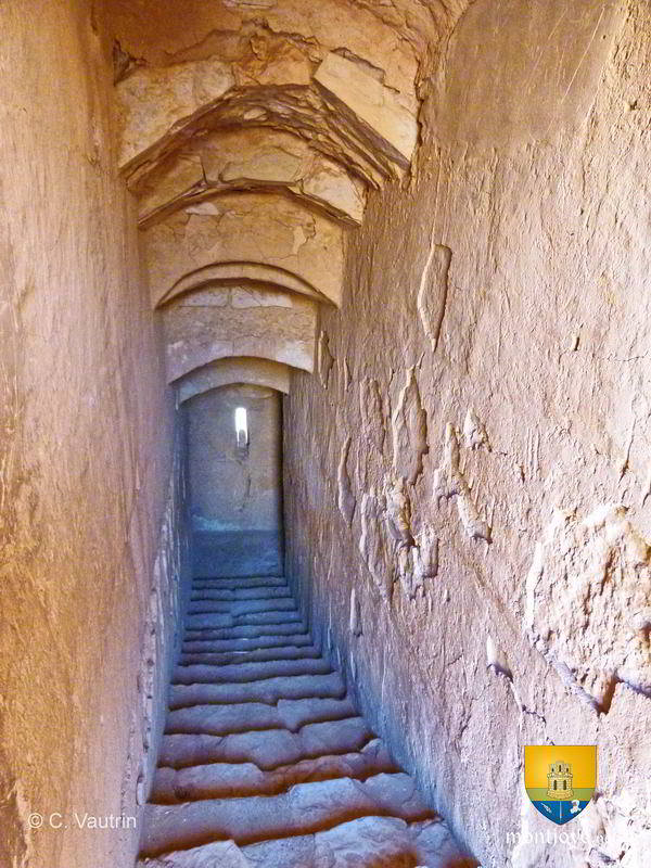 L'entrée monumentale semble intégrée dans une forme de demi tour éventrée, obligeant cependant un éventuel visiteur à se découvrir, l'ouverture supérieure devait sûrement permettre d'identifier les personnes entrantes ,voir même à servir pour défendre la porte.