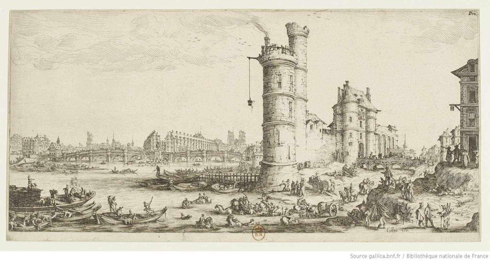 Composition empruntée à une gravure de jacques callot ( vers 1630 ), mais réalisation à la mode de l'époque à laquelle travaille Pieter Wouwermans, il n'a probablement pas réalisé cette peinture à Paris. Au fond on peut voir la Porte Dauphine et le Pont-Neuf de Paris.