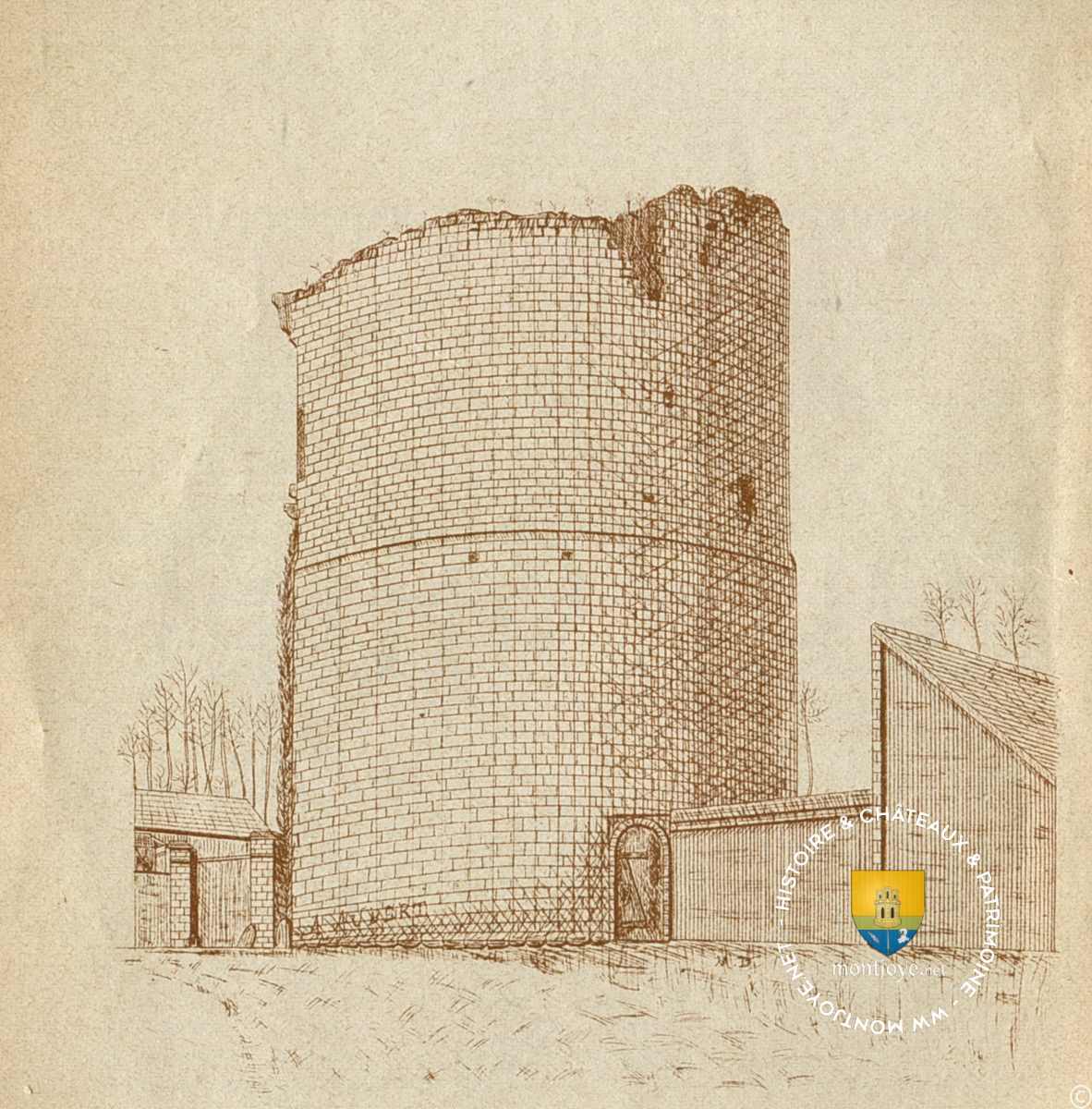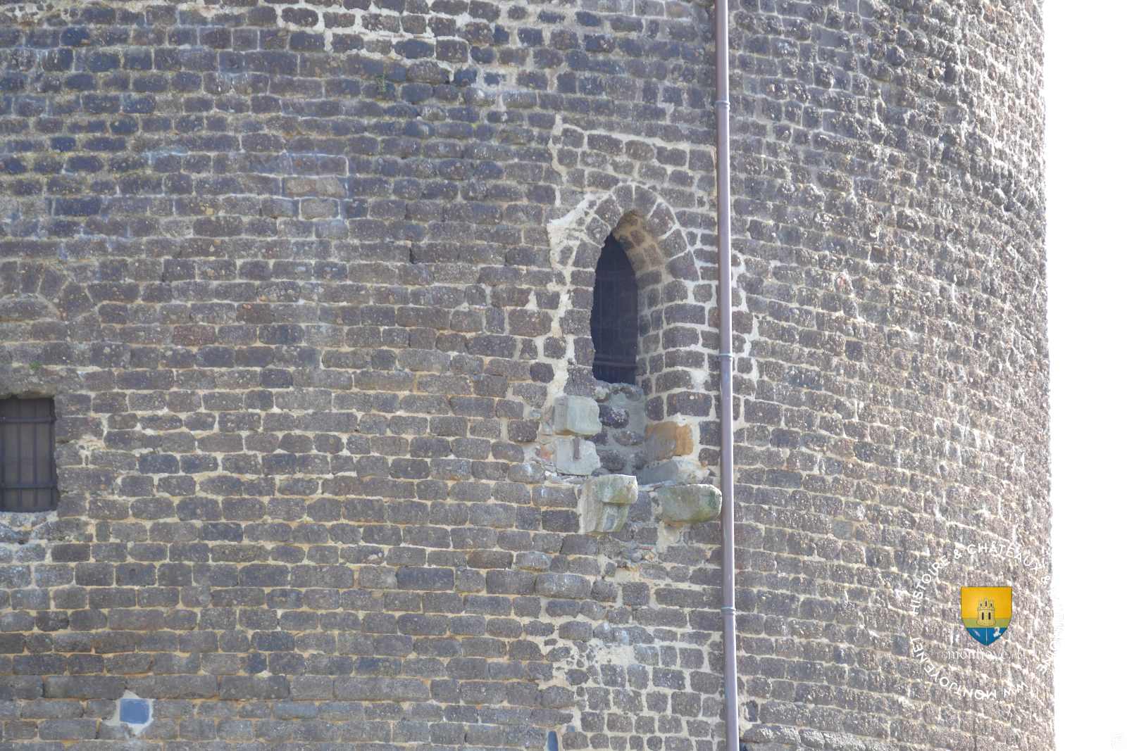 Des grisons, de huit pouces sur quatre, bien taillés, placés par assises, plein sur vide, c'est-à-dire le milieu d'une pièce sur la jointure de deux autres, parent élégamment toute la surface de la tour. La grandeur et la solidité de cet édifice, jointes à la régularité de sa construction, en font un des beaux monuments de l'architecture militaire du moyen fige." ( auteur inconnu )