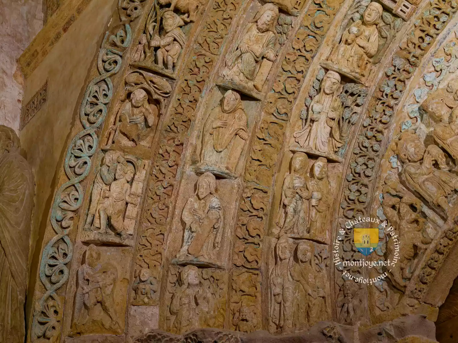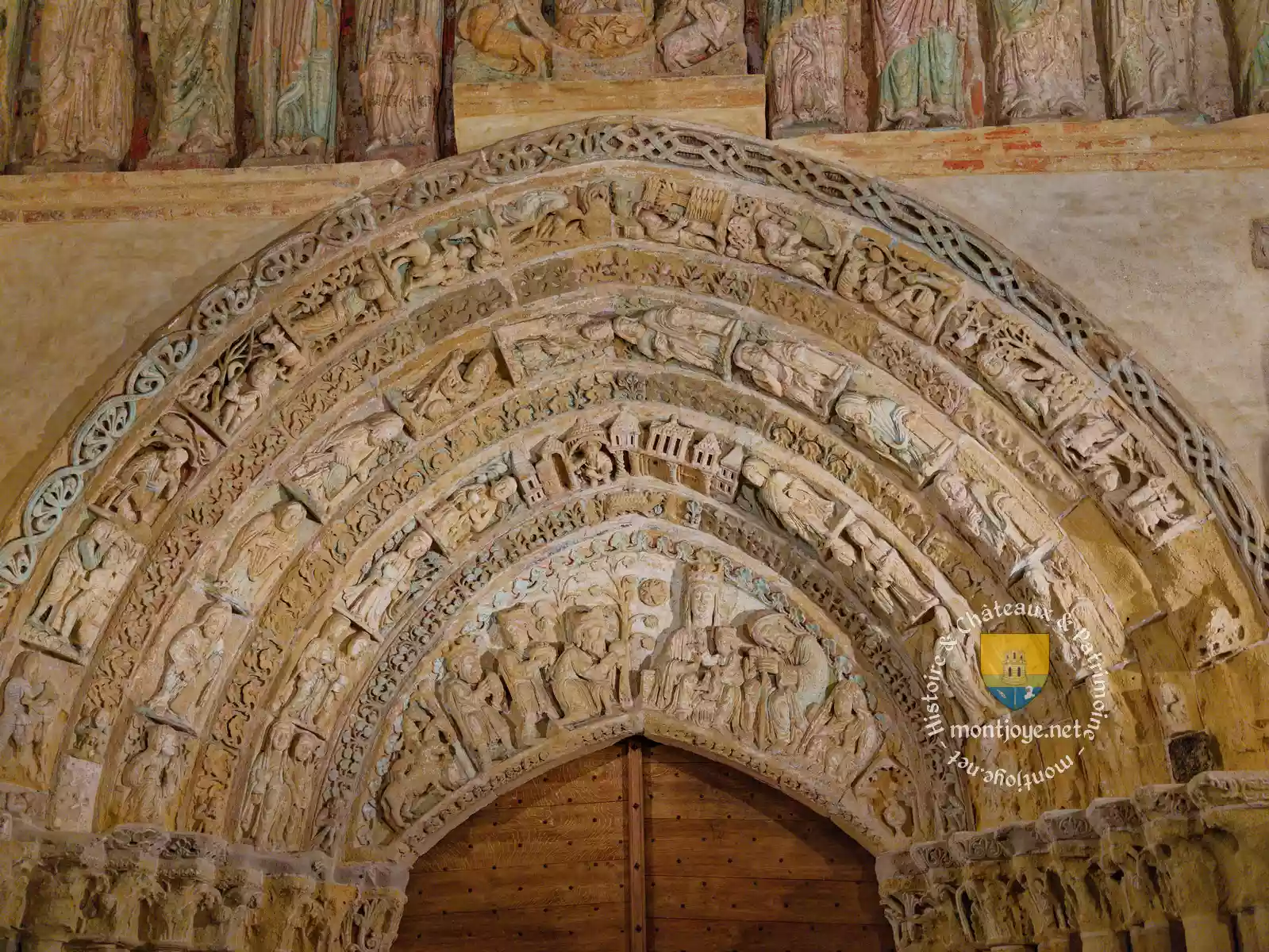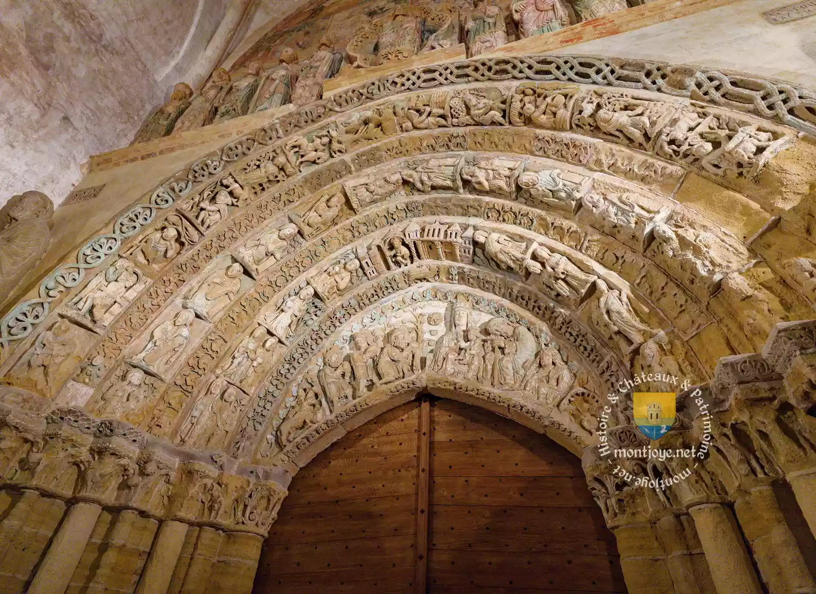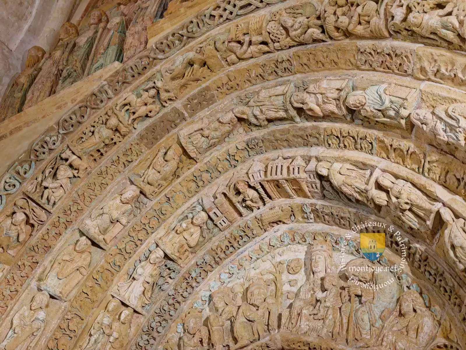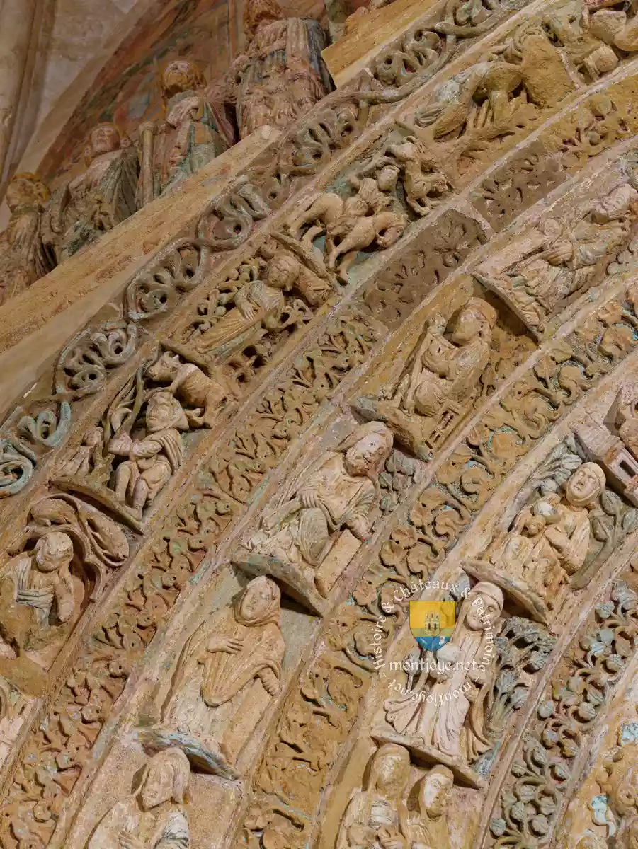 Le portail comporte trois colonnes et quatre colonnettes pour soutenir les trois voussures. Le tympan sculpté représente l'adoration des rois mages et les voussures représentent respectivement les Vierges Sages et Folles, les prophètes de l'Ancien Testament et le roi David, et les occupations des douze mois de l'année et les signes du zodiaque.