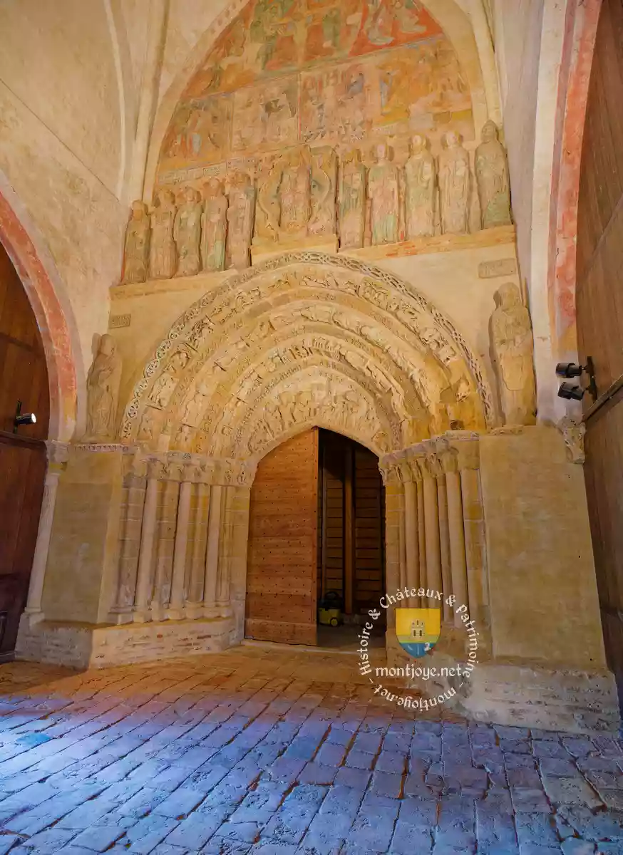 Au cours de la première moitié du XIIe siècle, les moines bénédictins ont entrepris la construction d'une église comprenant un choeur et une nef voûtée, un clocher à la croisée du transept ainsi qu'un clocher-porche, jusqu'à son effondrement au XVIIIe siècle. En 1898, en raison de la dégradation de l'église et sur les conseils de l'architecte Clouet, la partie orientale entière a été détruite et seul le clocher-porche a été conservé. La restauration du clocher-porche a eu lieu entre 1981 et 1986, celle des sculptures a commencé en 1998 et les peintures murales ont été redécouvertes en 2005.