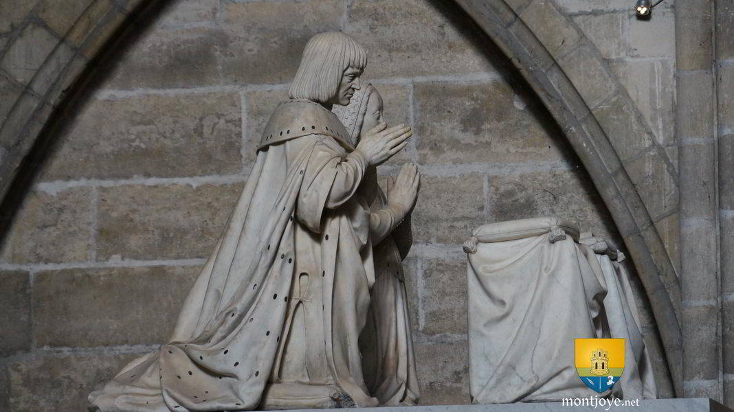 « Sur la plate-forme supérieure, se trouvent les statues des défunts, appelées priants ou orants. Les souverains agenouillés prient pour la vie à venir. À l'intérieur du mausolée, le couple royal est représenté en "transi" et figé dans la mort. On a fait figurer sur leurs abdomens, par souci de réalisme, l’ouverture recousue nécessaire à l’éviscération. » source Tourisme 93