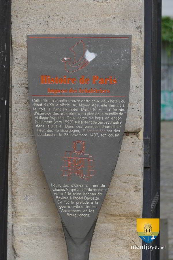 Impasse des Arbalétriers dans le 3ième arrondissement de Paris. Cette impasse donnait vers l'hôtel de Barbette et le camp d'entrainement des Arbalétriers ( d'où son nom ).