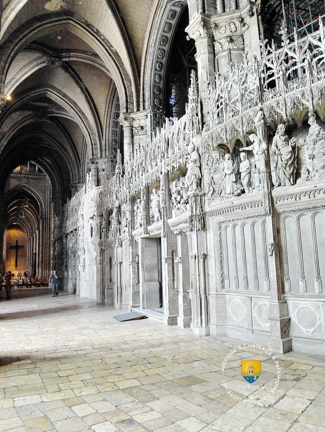 En 1753, les chanoines commencèrent, pour ainsi dire, la dévastation du chœur. On recouvrit les colonnes d’un stuc vulgaire et l’on remplaça les huit tentures par les huit bas-reliefs qui font le désespoir des admirateurs du Moyen Age. Bridan sculpta le groupe de l’Assomption dont il est inutile de parler.