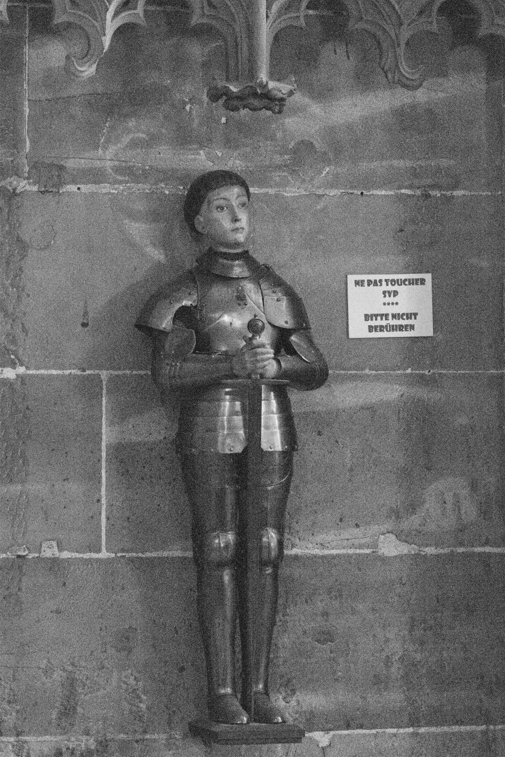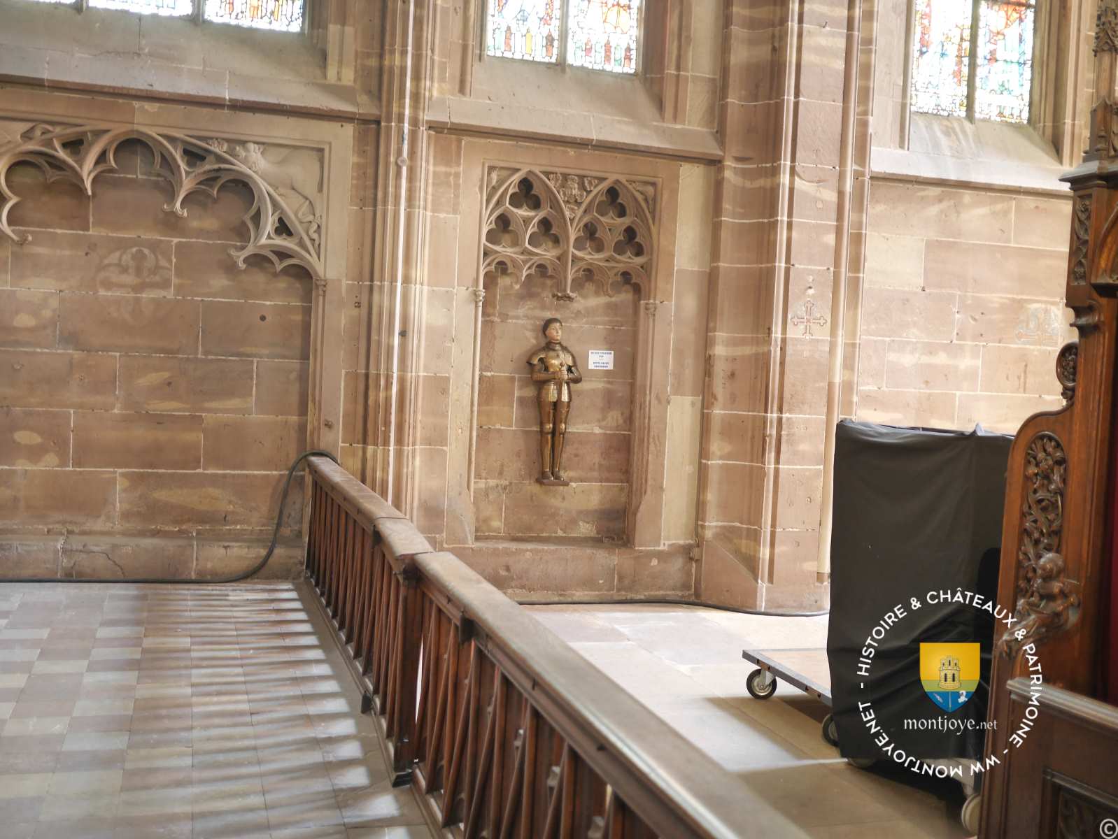 Belle statue de Jeanne d'Arc réalisée en 1937, elle est aujourd'hui dans la chapelle Sainte-Catherine. Elle fut sculptée en bois dans un atelier à Ribeauvillé, elle est habillée d’une véritable armure de fer fabriquée à Paris. Il faut souligner qu'il n'existe à l'heure aucun portrait de Jeanne d'Arc et que donc sa ressemblence serait fortuite, néanmoins c'est une des rares statues à lui attribuer la véritable coupe de cheveux en bol, au ras des oreilles, comme il était coutûme de faire pour ceux qui portaient une armure pendant la guerre de Cent-Ans. L'armure s'inspire de l'époque contemporaine de Jeanne, néanmoins on notera l'attache au niveau du plastron et le porte lance qui furent probablement absents de la véritable armure. Malgré tout cela certains sites mal inspirés parle de cette statue comme un mystère...