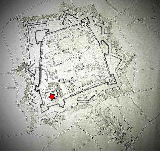 Bapaume au XVIIIe ( source Wikipédia ), l'étoile rouge est l'emplacement de l'ancien château.
