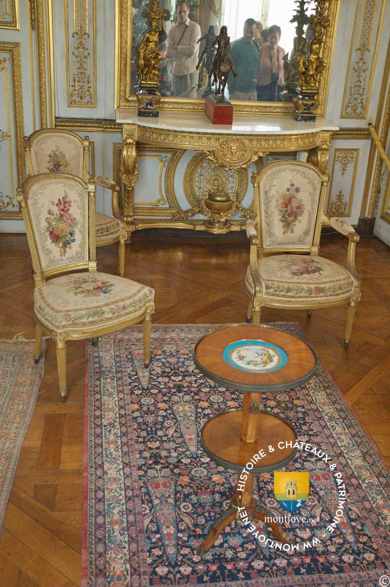 Au fond de la cour d’honneur, d’aspect très élégant, un vestibule conduit au grand escalier, de forme elliptique, dont la magnifique rampe en fer forgé, œuvre des frères Moreau, rappelle les meilleurs morceaux des maîtres français du siècle dernier. Par cet escalier on accède aux appartements du Châtelet, au salon des Chasses, à la bibliothèque, aux boudoirs décorés de peintures, souvent reproduites, représentant des scènes de genre, dont les rôles sont joués par des singes et des guenons, galamment costumés en marquis et en marquises. Viennent ensuite les appartements du duc d’Aumale et la belle galerie où le prince de Condé avait fait retracer ses hauts faits. C’est dans le Châtelet que se trouve le trophée de Rocroy, glorieux faisceau de drapeaux auquel le duc d’Aumale a ménagé une place d’honneur.