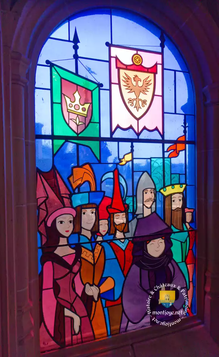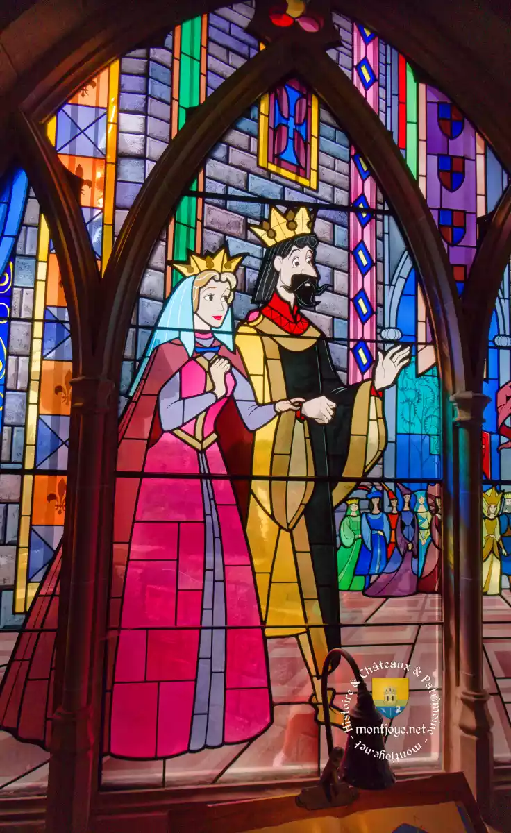 Le château possède des vitraux, avec un vitrail avec un système dit de polage qui permet notamment de donner des variations de lumières et de forment selon la lumière et les angles de vues. Le vitrail au rez de chaussé représentant les colombes représentant le chant et l'autre la beauté par la rose, les deux dons de la belle au bois dormant. Les vitraux ont été réalisés par Peter Chapman, un spécialiste anglais reconnu dans le monde du vitrail, il a travaillé notamment sur les restaurations des vitraux de Notre Dame de Paris. Il avait alors plus de 80 ans lorsqu'on lui propose d'y travailler alors qu'il était déjà à la retraite.