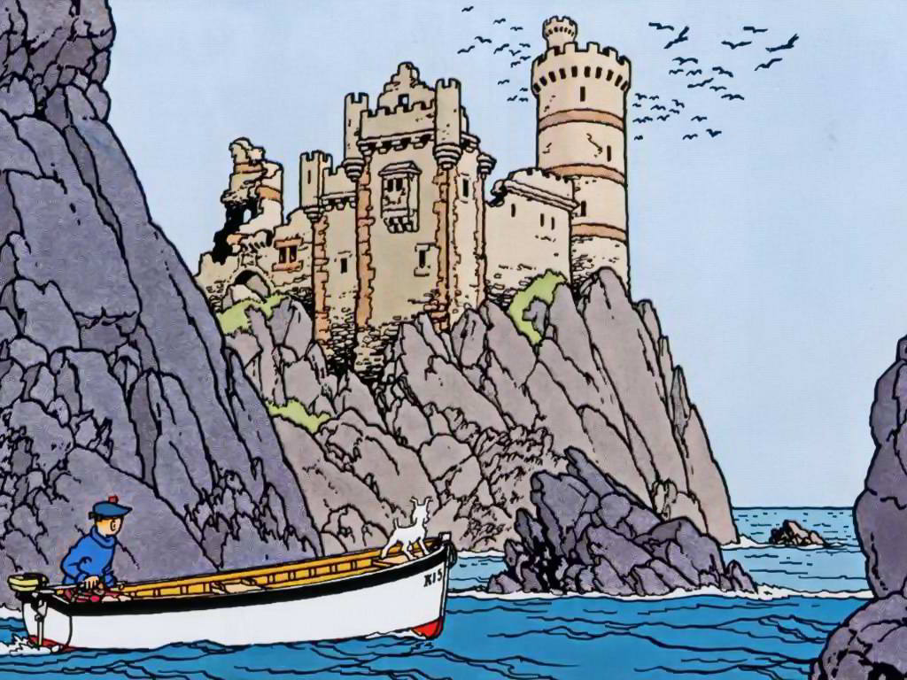 C’est de ce dernier album dont il s’agit, en effet Bob de Moor, assistant en chef d’Hergé, a suivi les traces de Tintin et se serait inspiré des lieux pour produire la nouvelle série de dessin d’arrière-plan. On note en effet quelques ressemblances troublantes. Néanmoins au sujet de l’île et du château plusieurs versions ou suppositions circulent.
