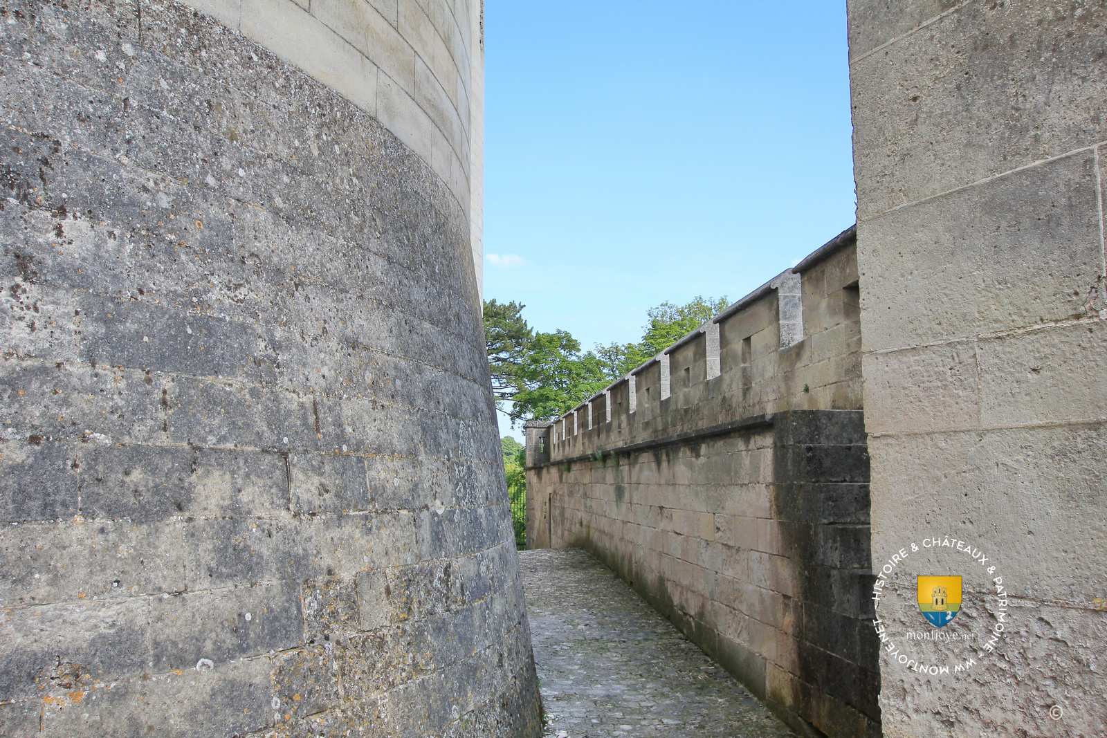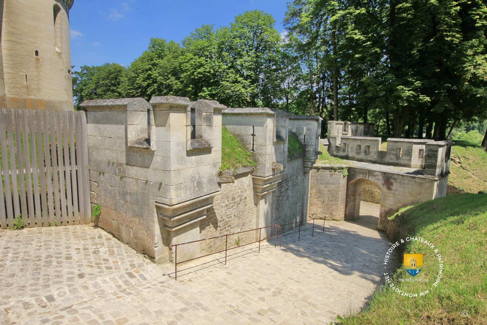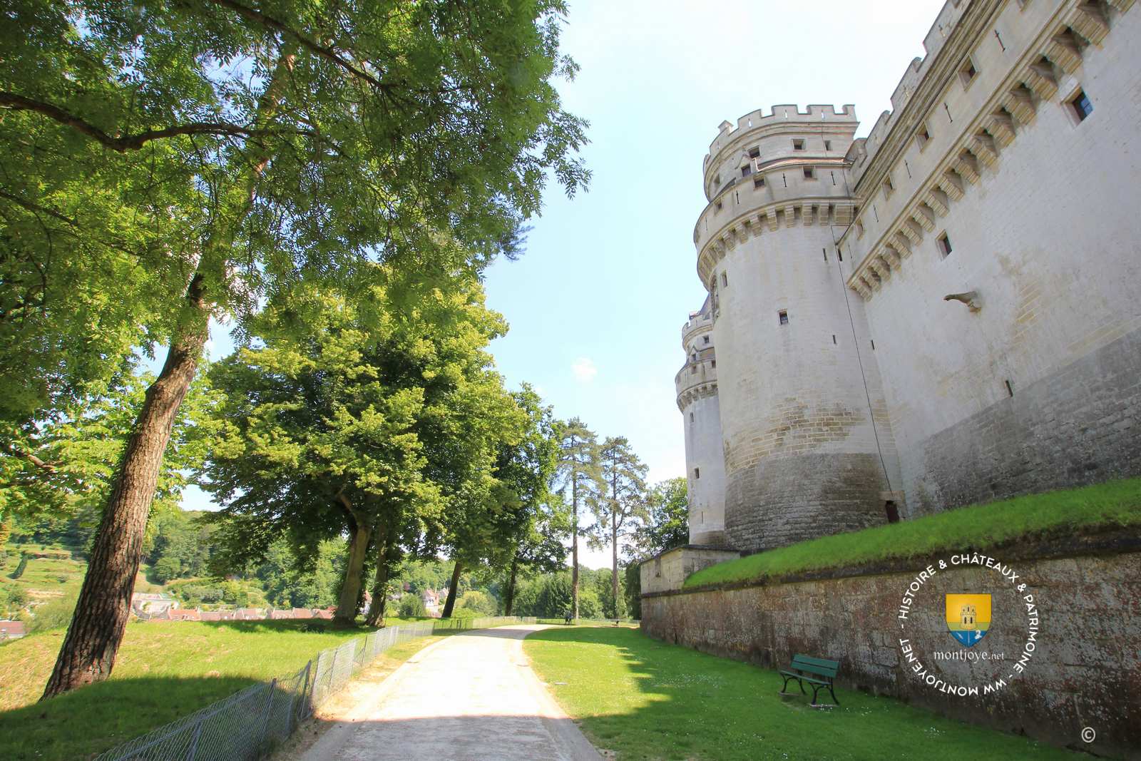 Le château de Pierrefonds est situé à vingt-cinq mètres au-dessus du petit lac, à l’extrémité d’un étroit promontoire. Une vallée assez profonde l’entoure sur trois côtés ; un fossé achève de l’isoler sur le quatrième coté. D’importantes fortifications précèdent les murailles, surtout en face du donjon, auquel on accède par une série de pont-levis et de herses. Huit tours flanquent ses énormes murailles et chacune d’elles porte la statue et le nom d’un preux : César, Charlemagne, Artus, Alexandre, Godefroy de Bouillon, Josué, Hector et David. Le donjon défendu par les formidables tours de César et de Charlemagne, et surmonté de deux élégantes tourelles de guetteur, domine tout le château de sa masse superbe. L’ensemble est d’une majesté incomparable.