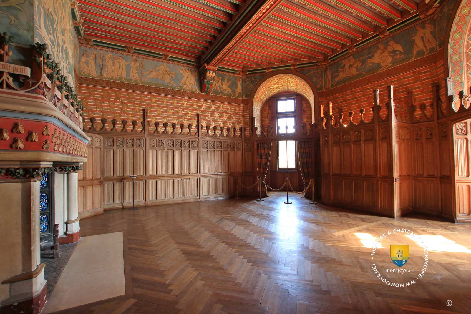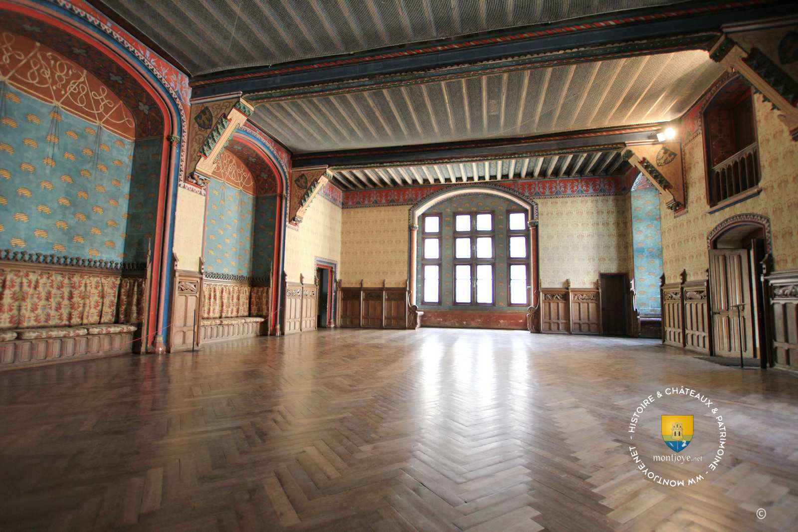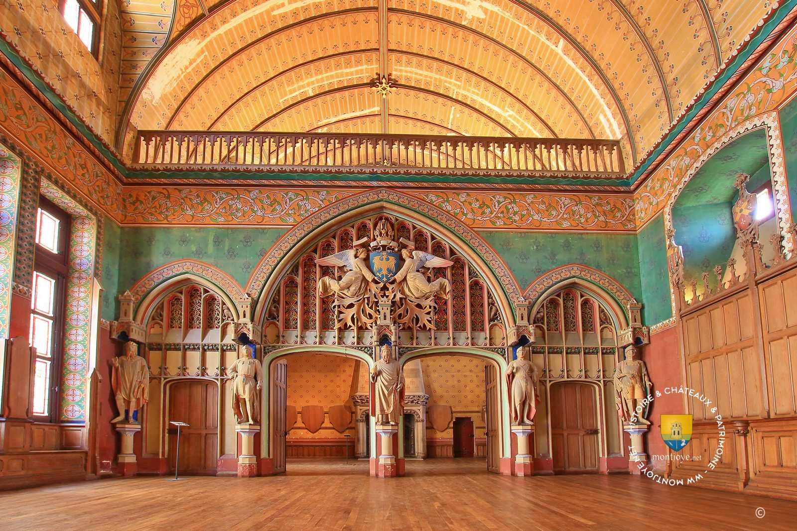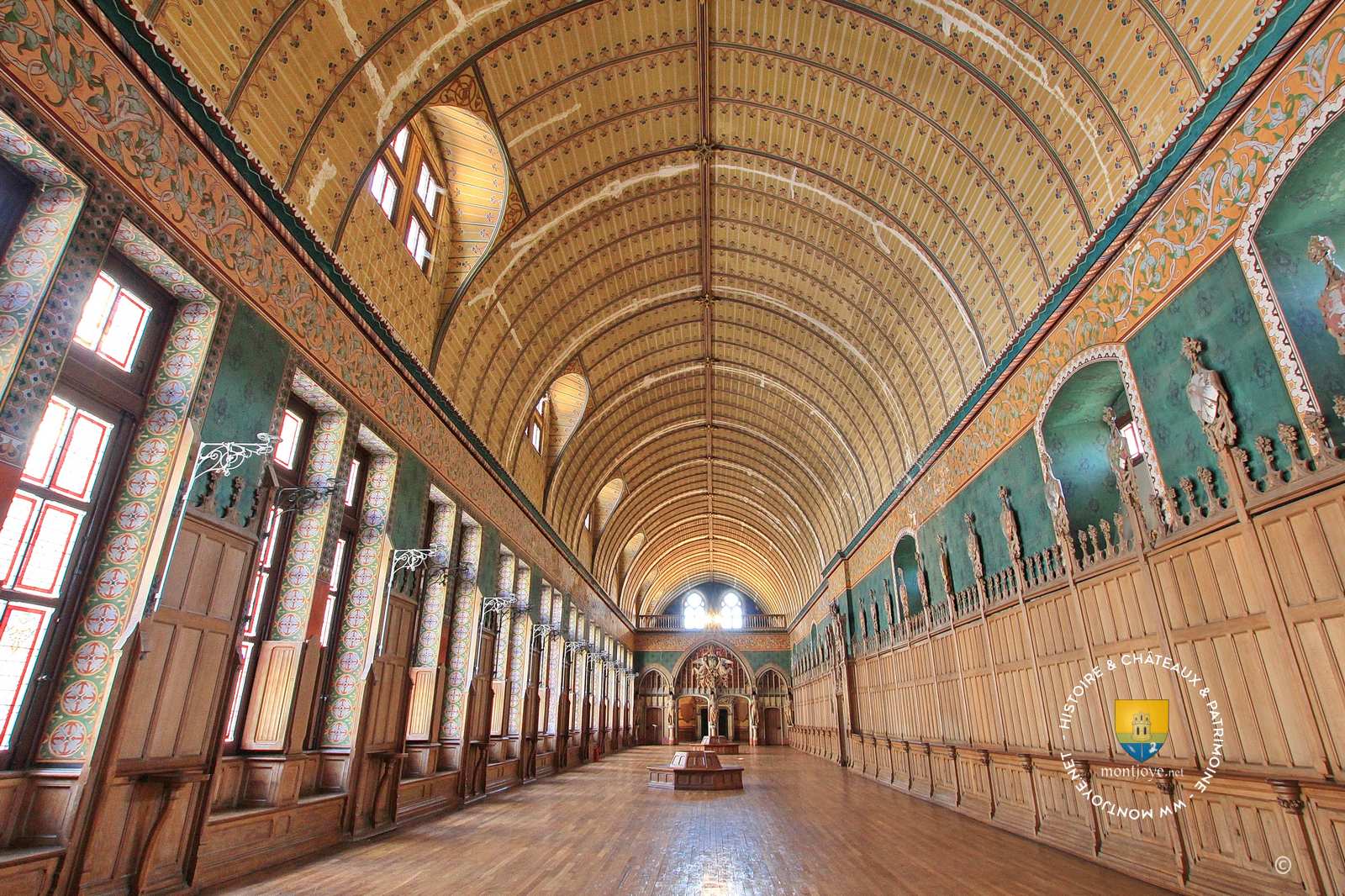 Au sortir du donjon, l'on pénètre dans les bâtiments qui renferment les grandes salles du château. La galerie seigneuriale est précédée d un vestibule suppôt- tant une vaste tribune où l’on plaçait les musiciens pendant les banquets et les lètes. La porte est toute brillante de sculptures et de dorures. La voûte, décorée d’ingénieux rinceaux, est lambrissée eh berceau et percée de grandes lucarnes du côté de la cour. Le manteau de la cheminée à double foyer qui fait lace a l’entrée est orné des statues peintes des neuf preuses : Sémiramis, Déifemme, Lampédo, Hippolyte, Déiphile, Thamyris, Tanqua, Ménelippe et Pentésilée. Les embrasures des fenêtres sont peintes de fines arabesques. Cette superbe galerie n’a pas sa rivale en France. Elle contenait autrefois la collection d’armes particulière de Napoléon III.