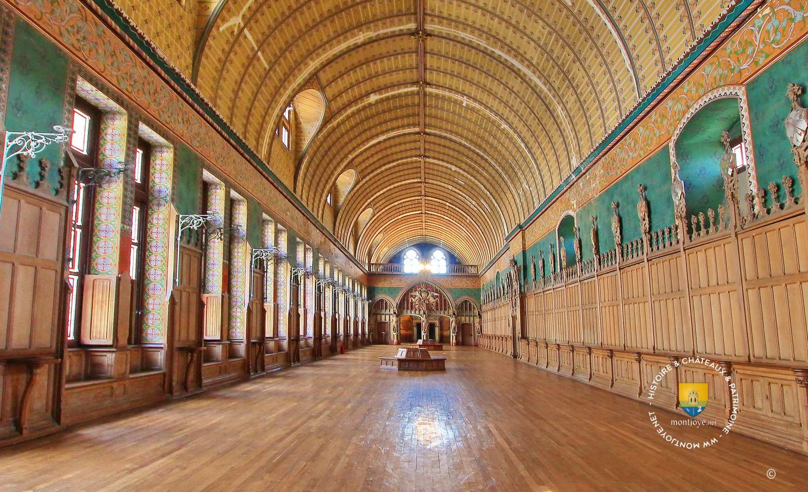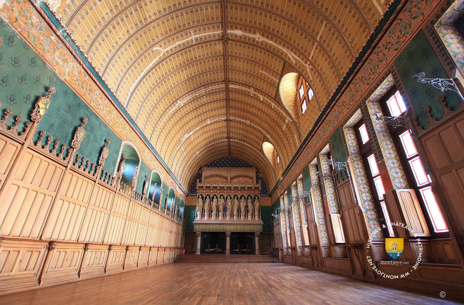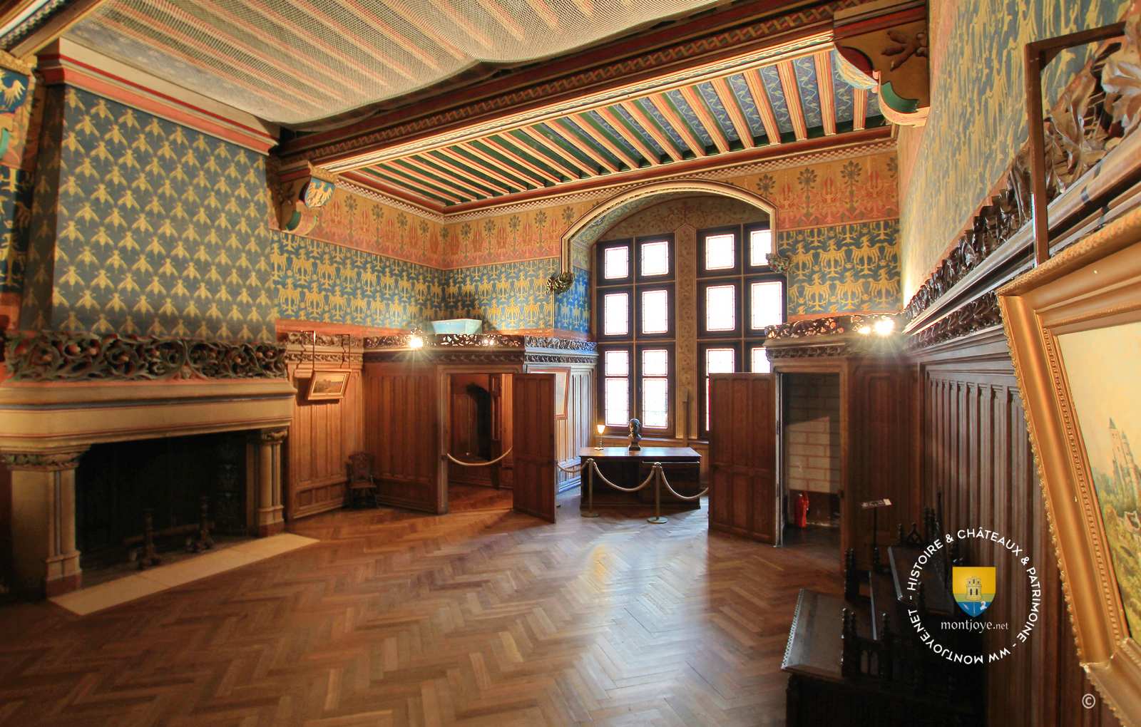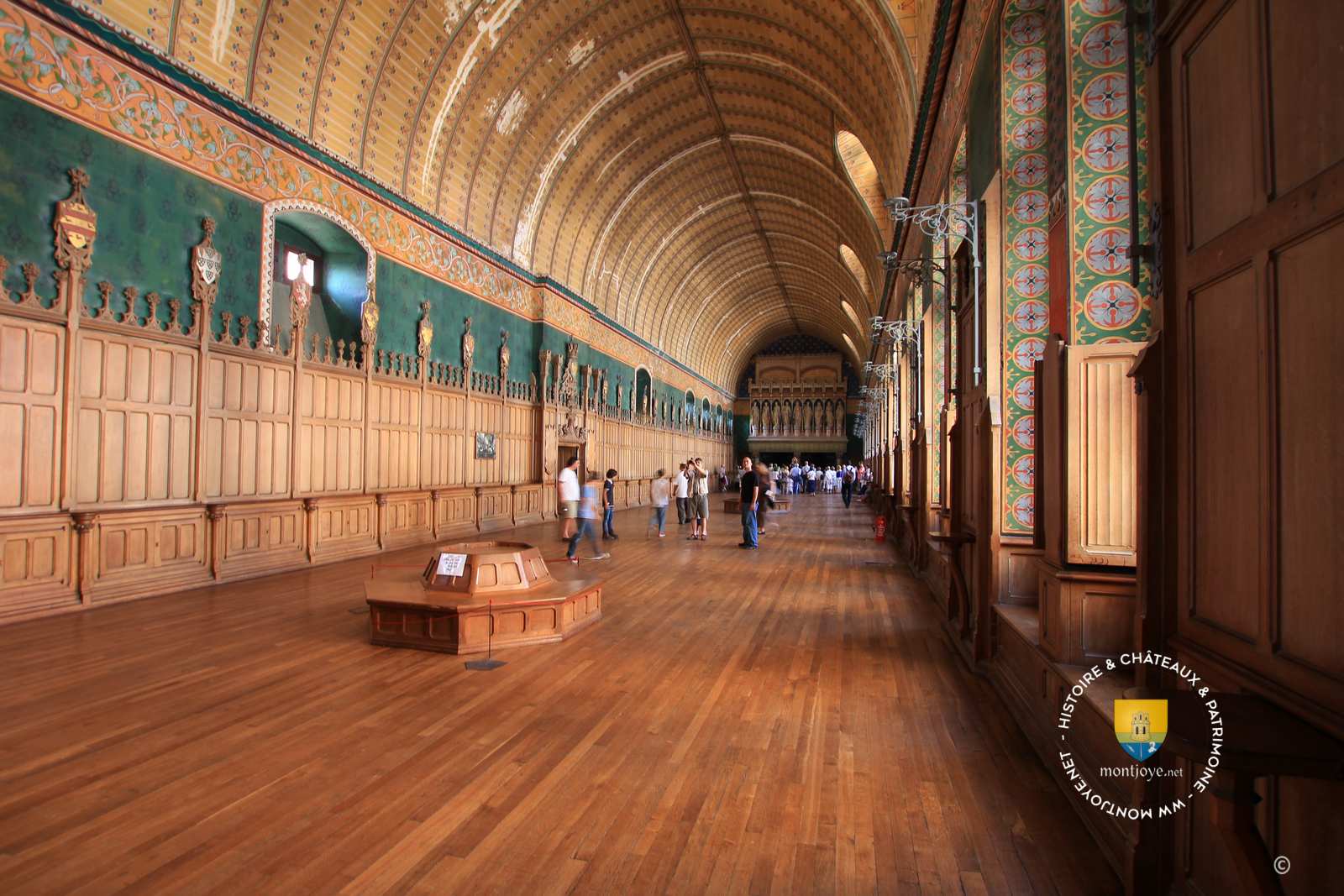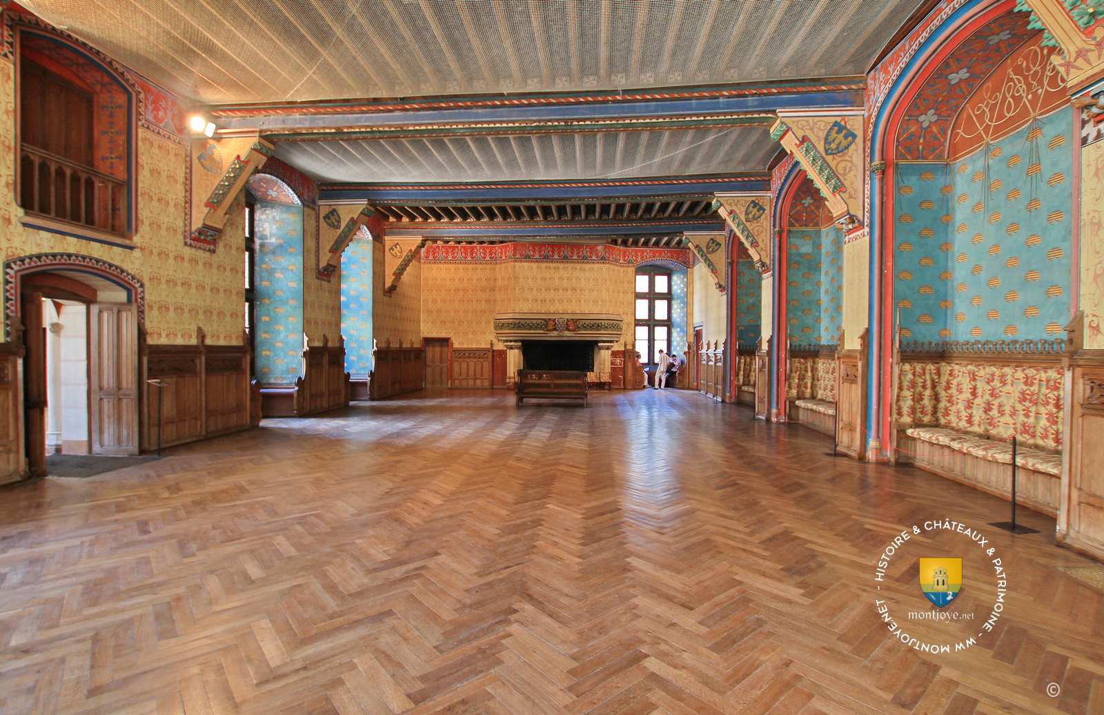 Au sortir du donjon, l'on pénètre dans les bâtiments qui renferment les grandes salles du château. La galerie seigneuriale est précédée d un vestibule suppôt- tant une vaste tribune où l’on plaçait les musiciens pendant les banquets et les lètes. La porte est toute brillante de sculptures et de dorures. La voûte, décorée d’ingénieux rinceaux, est lambrissée eh berceau et percée de grandes lucarnes du côté de la cour. Le manteau de la cheminée à double foyer qui fait lace a l’entrée est orné des statues peintes des neuf preuses : Sémiramis, Déifemme, Lampédo, Hippolyte, Déiphile, Thamyris, Tanqua, Ménelippe et Pentésilée. Les embrasures des fenêtres sont peintes de fines arabesques. Cette superbe galerie n’a pas sa rivale en France. Elle contenait autrefois la collection d’armes particulière de Napoléon III.