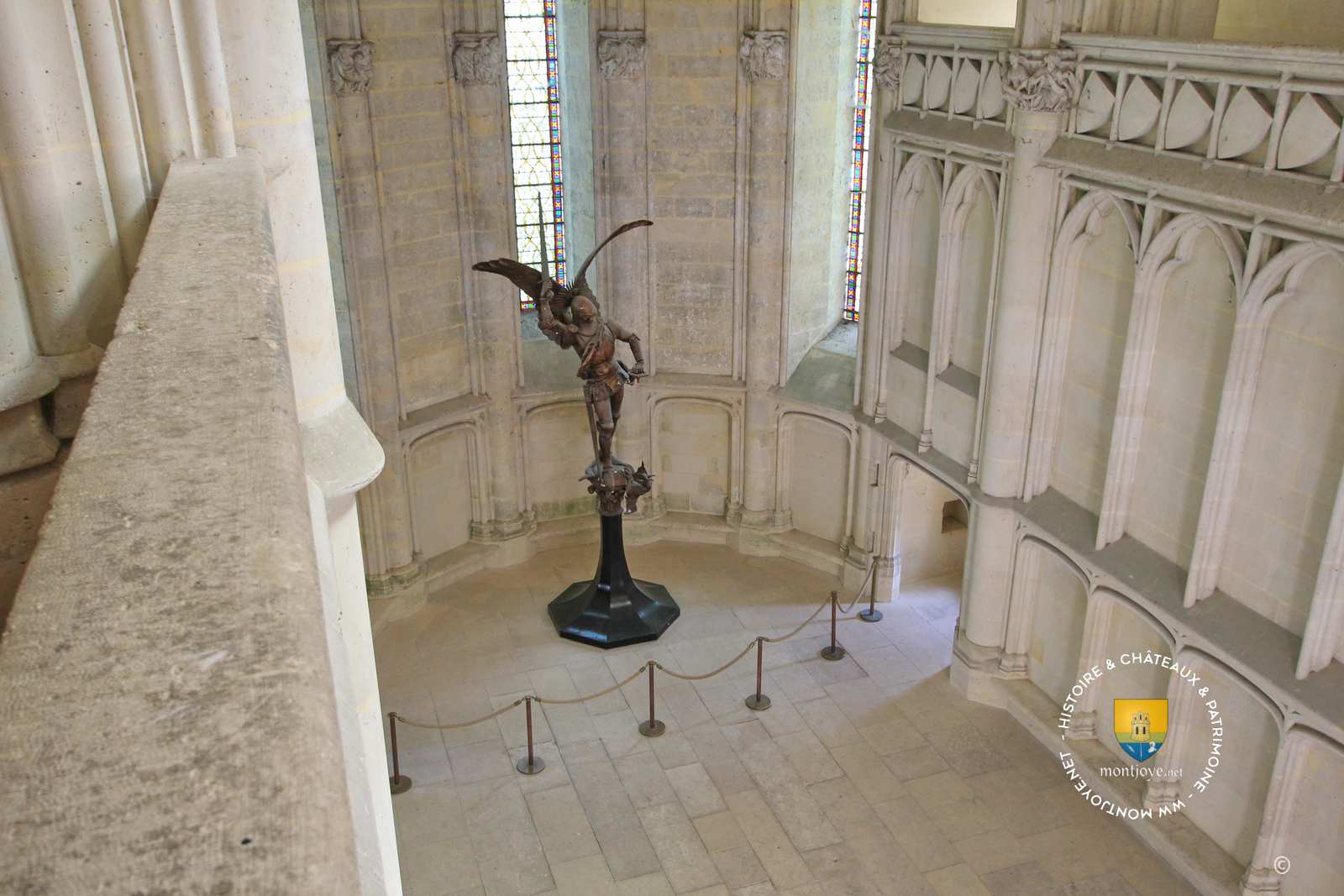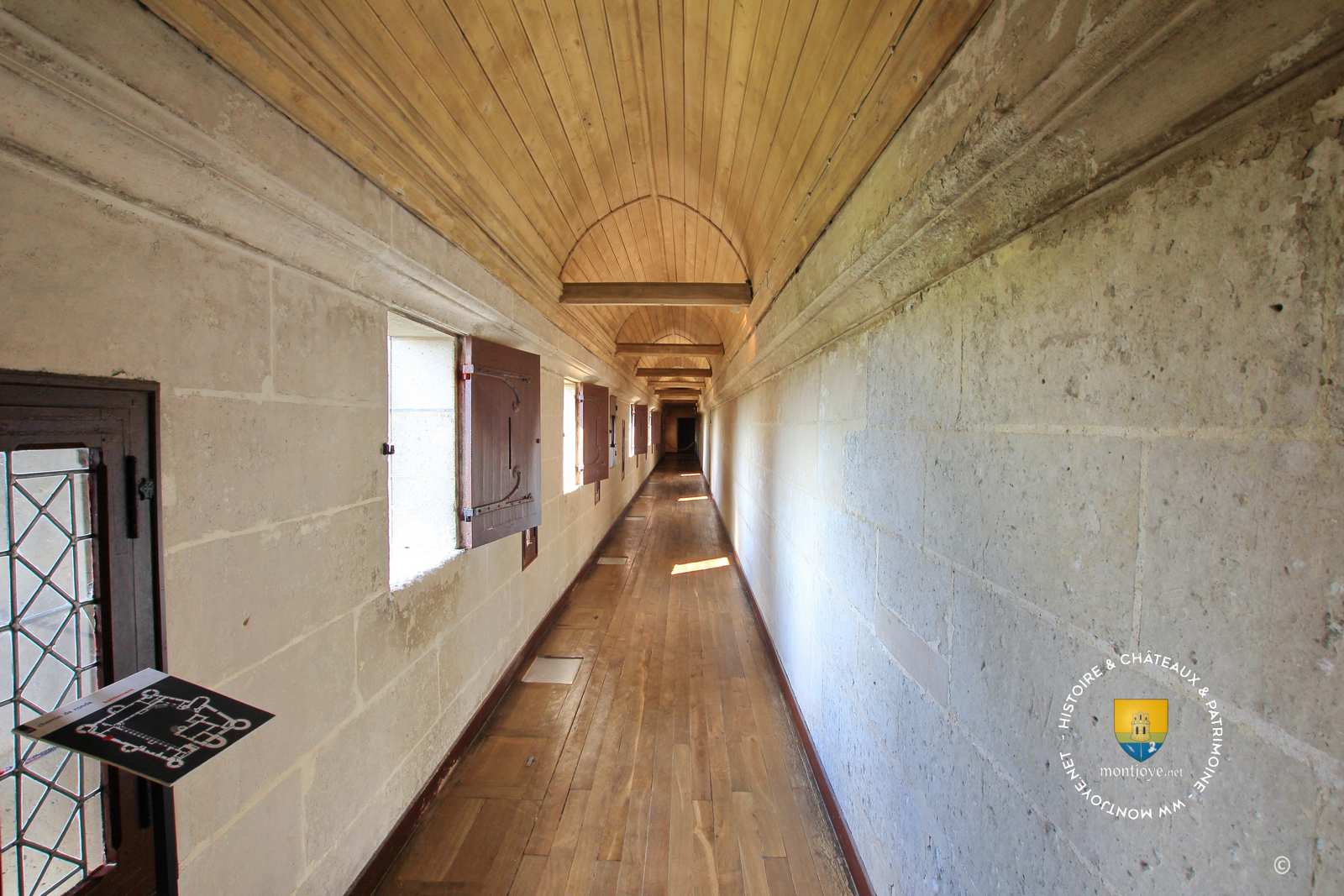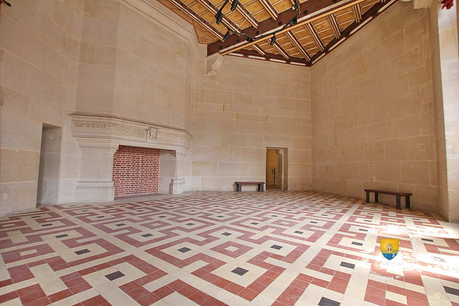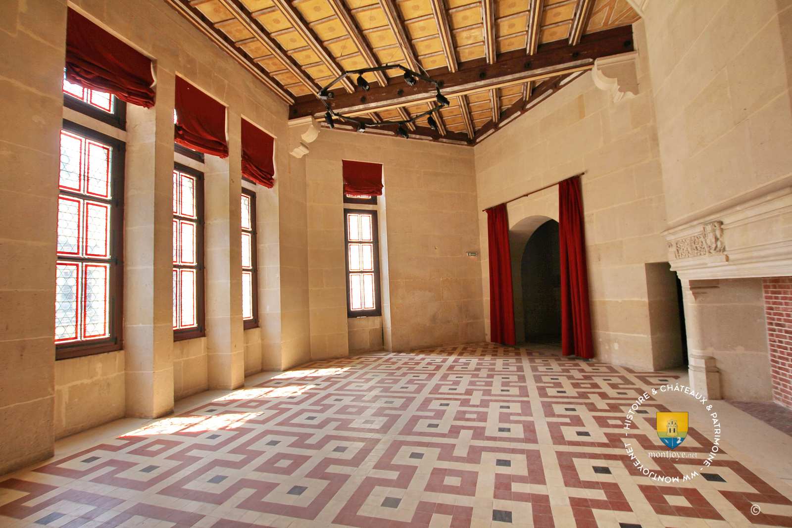 Au sortir du donjon, l'on pénètre dans les bâtiments qui renferment les grandes salles du château. La galerie seigneuriale est précédée d un vestibule suppôt- tant une vaste tribune où l’on plaçait les musiciens pendant les banquets et les lètes. La porte est toute brillante de sculptures et de dorures. La voûte, décorée d’ingénieux rinceaux, est lambrissée eh berceau et percée de grandes lucarnes du côté de la cour. Le manteau de la cheminée à double foyer qui fait lace a l’entrée est orné des statues peintes des neuf preuses : Sémiramis, Déifemme, Lampédo, Hippolyte, Déiphile, Thamyris, Tanqua, Ménelippe et Pentésilée. Les embrasures des fenêtres sont peintes de fines arabesques. Cette superbe galerie n’a pas sa rivale en France. Elle contenait autrefois la collection d’armes particulière de Napoléon III.