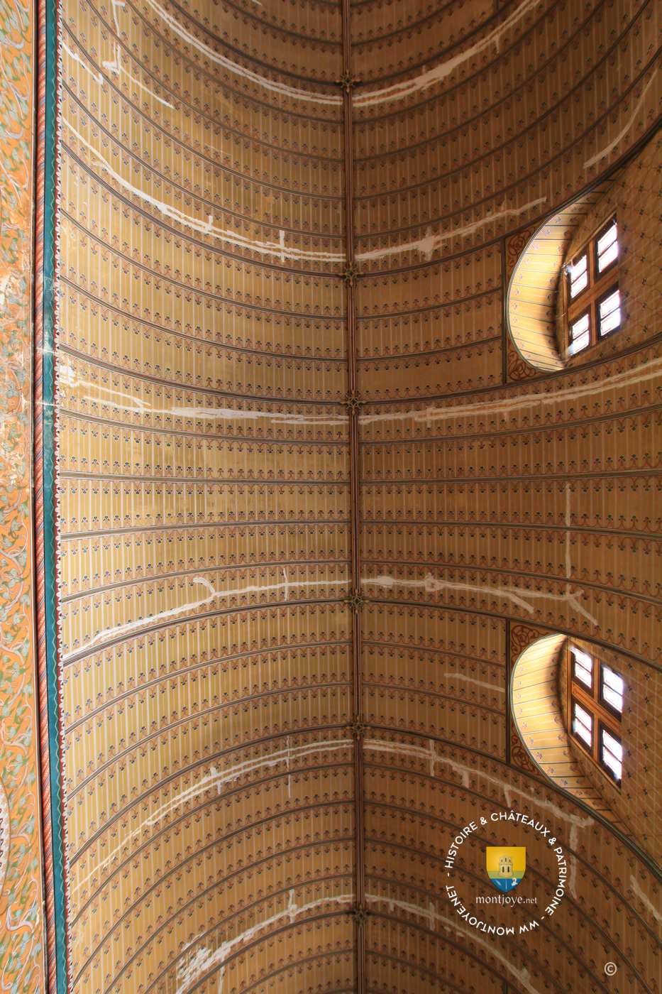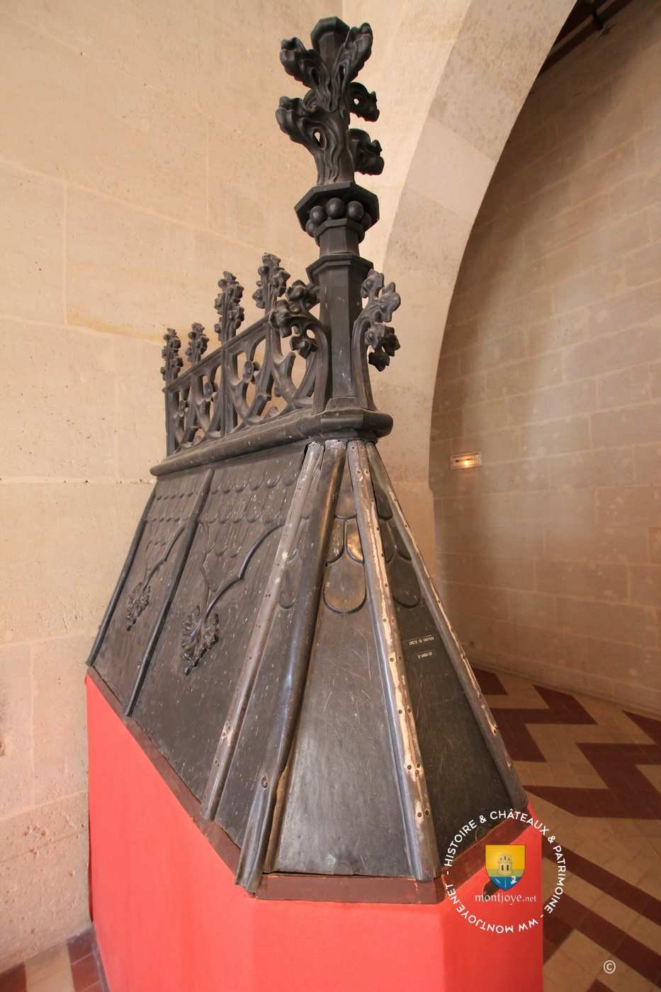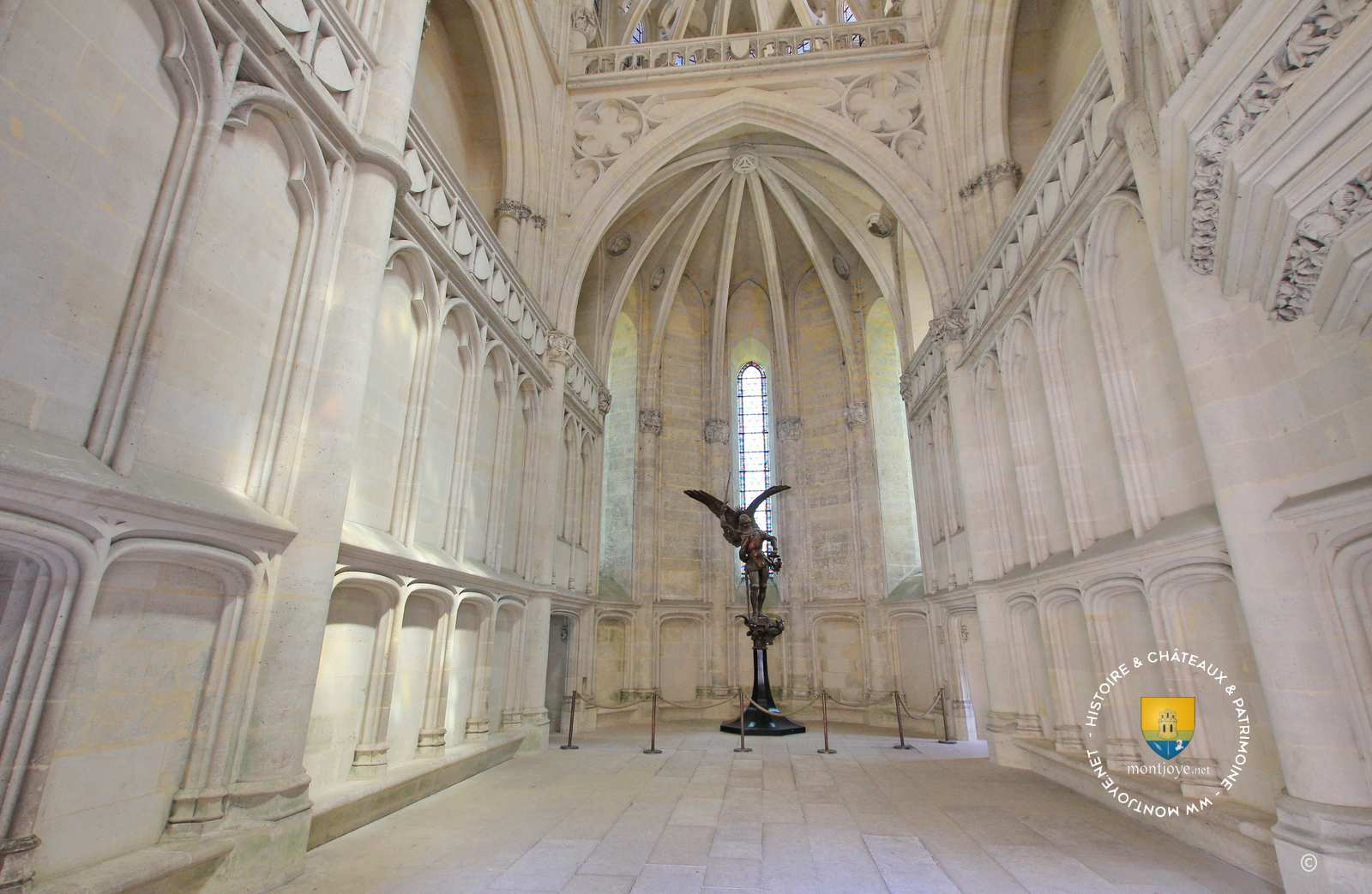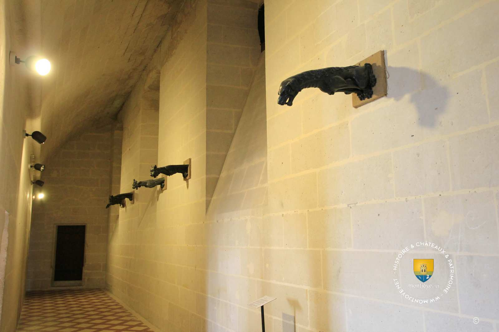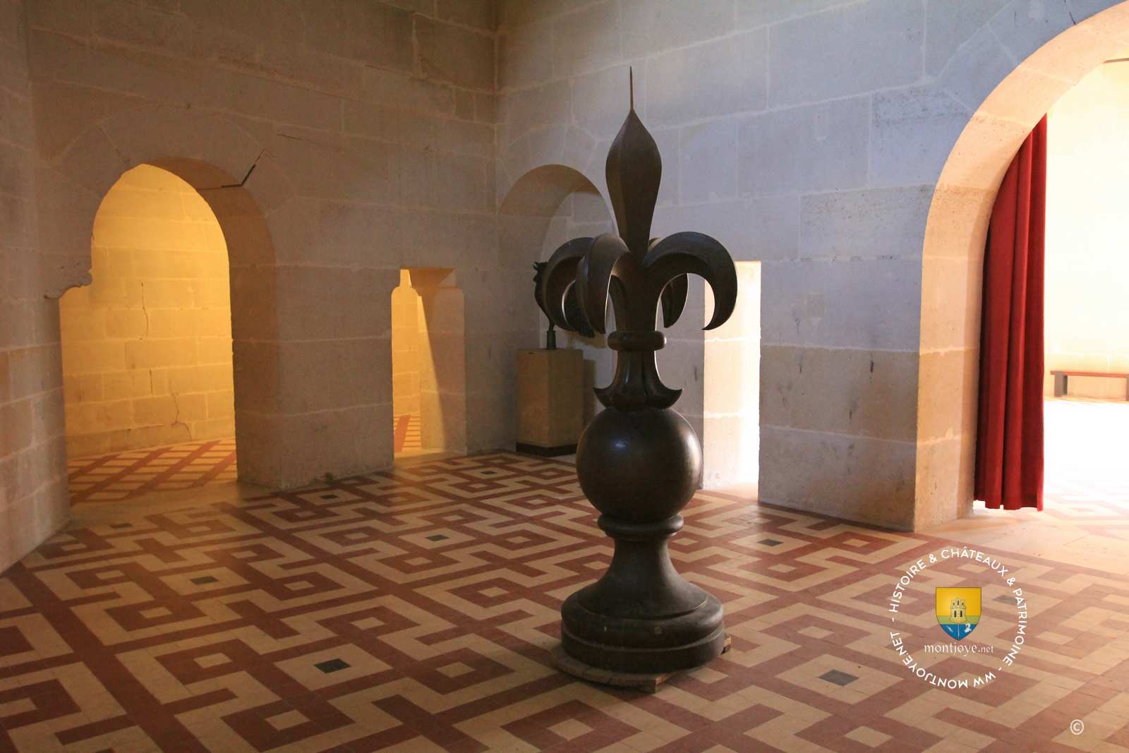 Au sortir du donjon, l'on pénètre dans les bâtiments qui renferment les grandes salles du château. La galerie seigneuriale est précédée d un vestibule suppôt- tant une vaste tribune où l’on plaçait les musiciens pendant les banquets et les lètes. La porte est toute brillante de sculptures et de dorures. La voûte, décorée d’ingénieux rinceaux, est lambrissée eh berceau et percée de grandes lucarnes du côté de la cour. Le manteau de la cheminée à double foyer qui fait lace a l’entrée est orné des statues peintes des neuf preuses : Sémiramis, Déifemme, Lampédo, Hippolyte, Déiphile, Thamyris, Tanqua, Ménelippe et Pentésilée. Les embrasures des fenêtres sont peintes de fines arabesques. Cette superbe galerie n’a pas sa rivale en France. Elle contenait autrefois la collection d’armes particulière de Napoléon III.