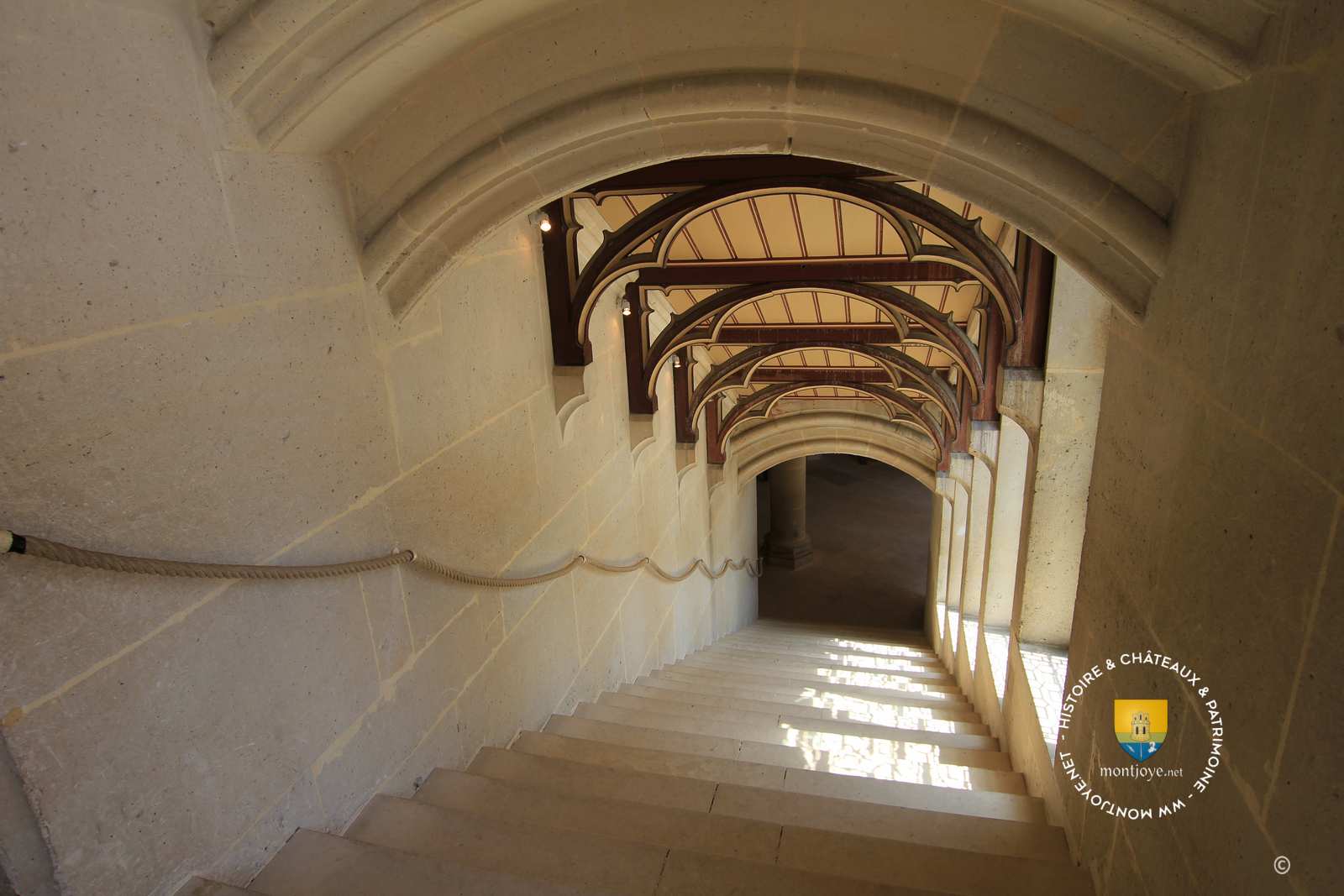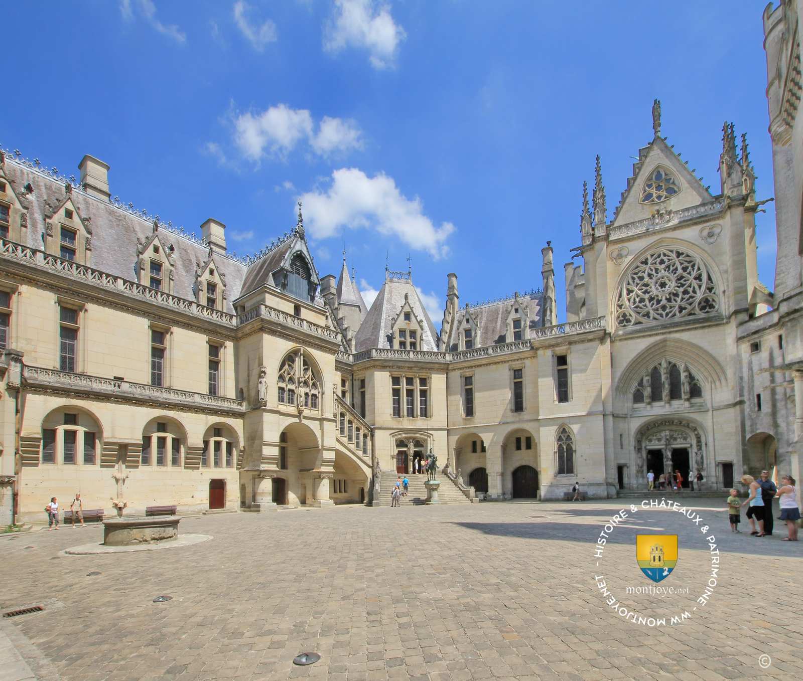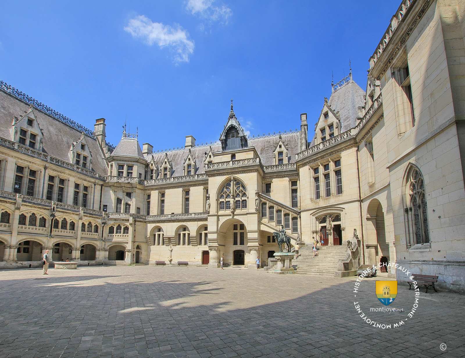 La grande cour, où 1 on pénètre par un passage fortifié, séduit d’abord par sa pittoresque irrégularité. A droite c’est le donjon, avec son gracieux escalier d’honneur tout brodé de fines sculptures; la chapelle, dont le joli portail rappelle les plus précieux monuments du quinzième siècle. A gauche, la grande galerie avec ses hautes fenêtres à meneaux ; en face, un logis droit coupé de pavillons de forme originale, auxquels on accède par un large perron précédé de la statue en bronze du duc Louis d’Orléans. Autant l’aspect extérieur du château est sévère et massif, autant ses façades intérieures sont élégantes et légères.