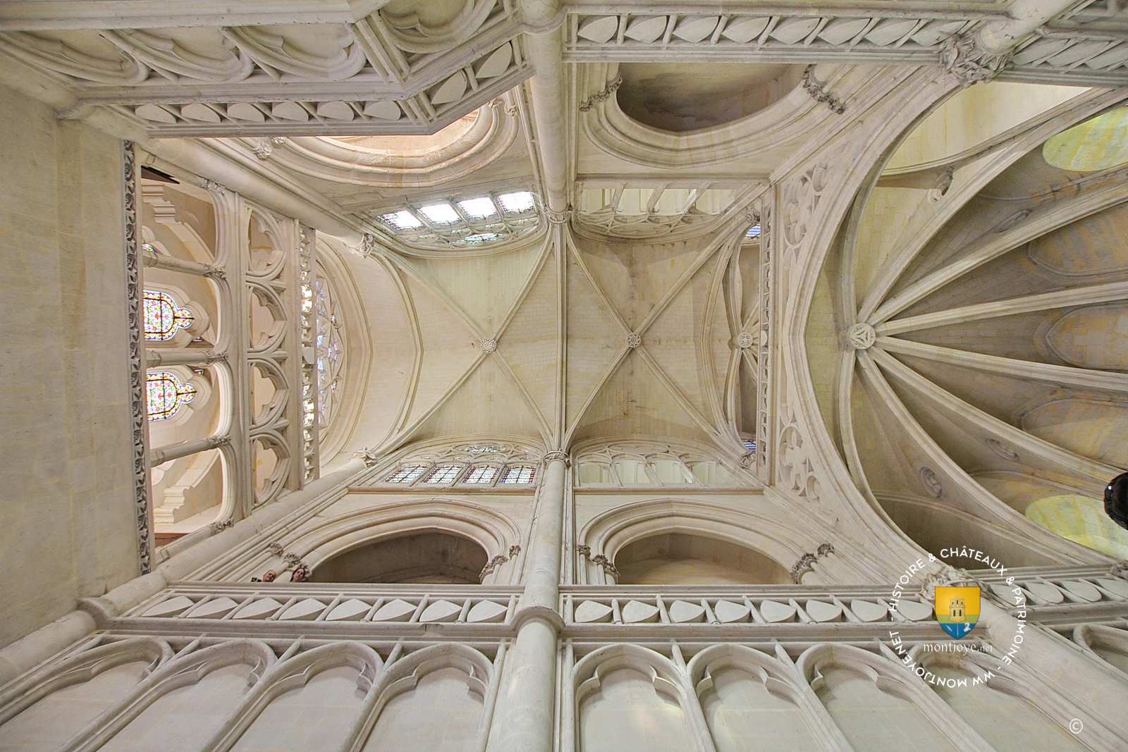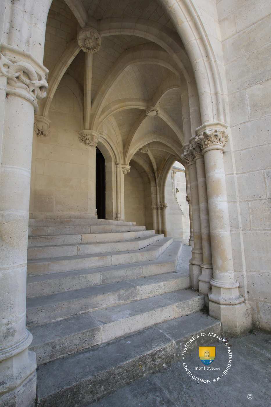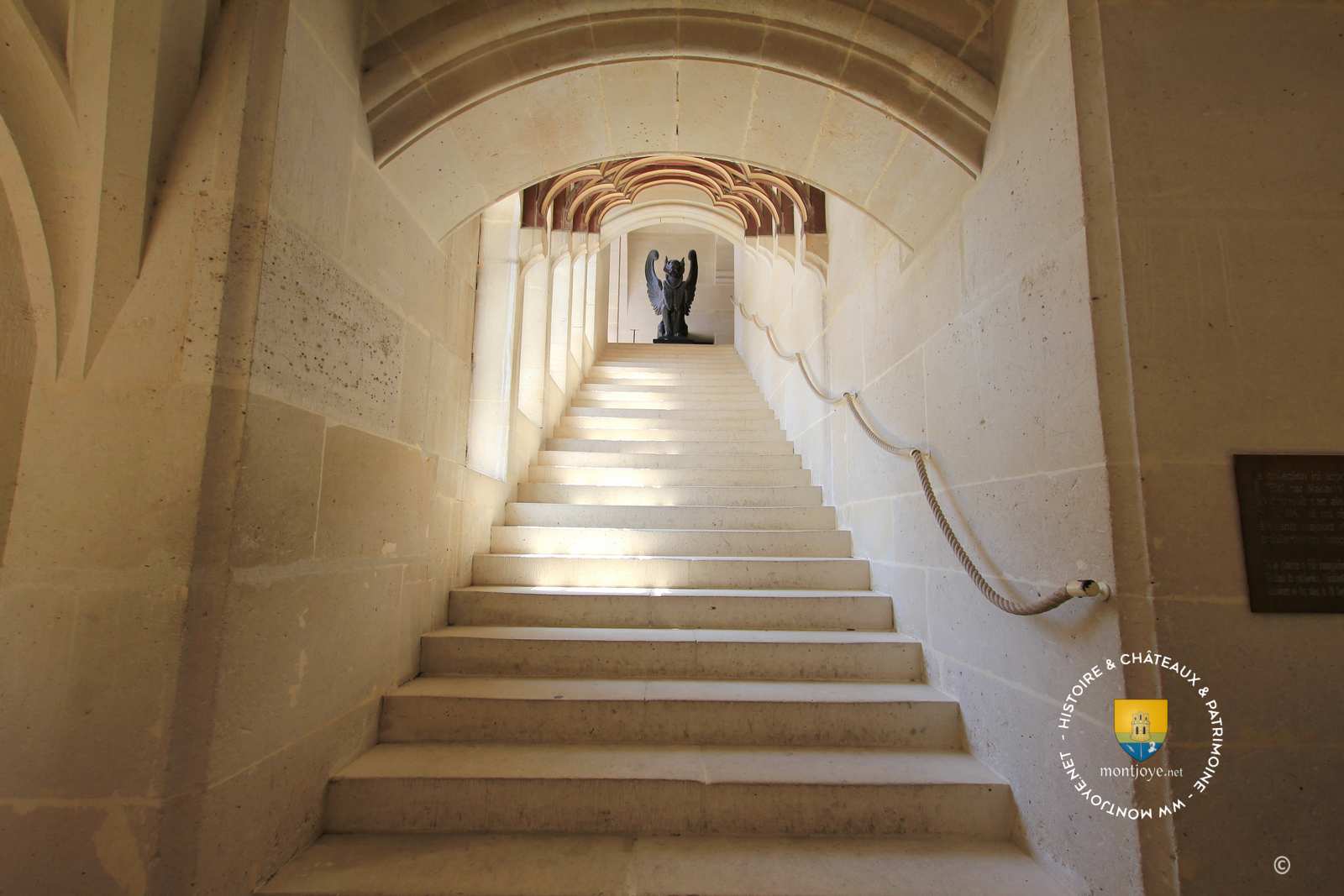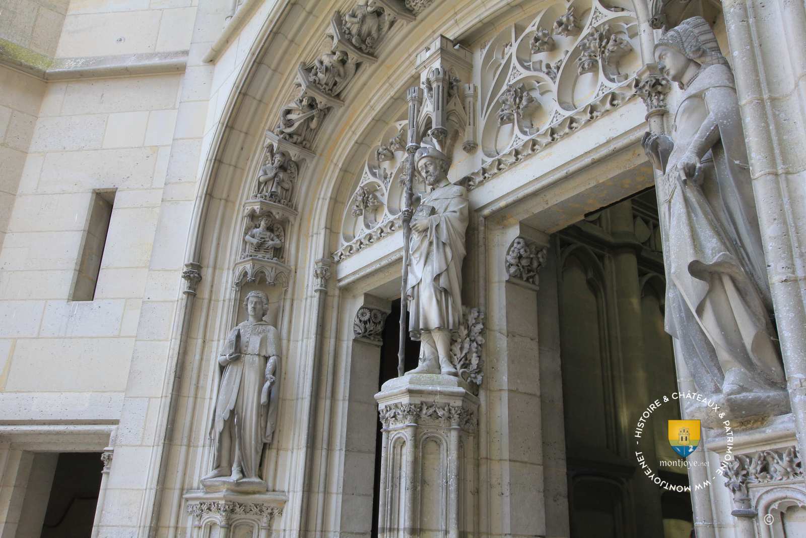 La grande cour, où 1 on pénètre par un passage fortifié, séduit d’abord par sa pittoresque irrégularité. A droite c’est le donjon, avec son gracieux escalier d’honneur tout brodé de fines sculptures; la chapelle, dont le joli portail rappelle les plus précieux monuments du quinzième siècle. A gauche, la grande galerie avec ses hautes fenêtres à meneaux ; en face, un logis droit coupé de pavillons de forme originale, auxquels on accède par un large perron précédé de la statue en bronze du duc Louis d’Orléans. Autant l’aspect extérieur du château est sévère et massif, autant ses façades intérieures sont élégantes et légères.