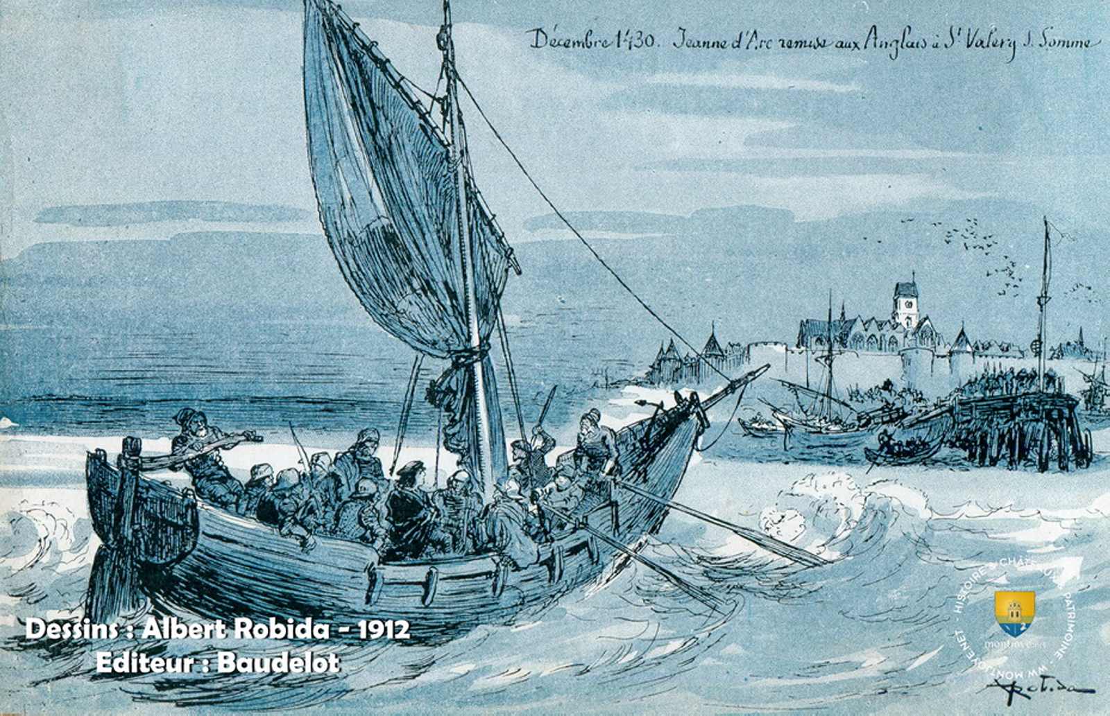 - 1430, Jeanne d’Arc est emmenée vers Rouen. En partant de Crotoy elle passe par Saint Valery sur Somme. Il est possible qu’elle fût enfermée quelques heures dans le cachot de la tour de Nevers, même si il n’existe aucune certitude à ce sujet mais une forte probabilité. Elle passera les Tours Guillaume en prenant la direction d’Arques la Bataille, entre temps il eut surement une autre étape mais inconnue aujourd’hui, elle est très probablement transportée dans une cage en fer ( ou bois ) dans un confort très sommaire. Il est possible que la situation "politique" de Saint Valery sur Somme soit à l'origine de l'enfermement de Jeanne à Crotoy, comme cela a été probablement à Saint Riquier. En effet le château et la ville de Saint Valery sur Somme est bien plus imposant que Crotoy, mais étrangement les Anglais n'ont pas choisis Saint-Valery, une situation similaire à Saint-Riquier où les Anglais ont choisi le château de Drugy, bien plus petit et à l'écart de la ville, pour l'y enfermer au lieu de Saint-Riquier.
