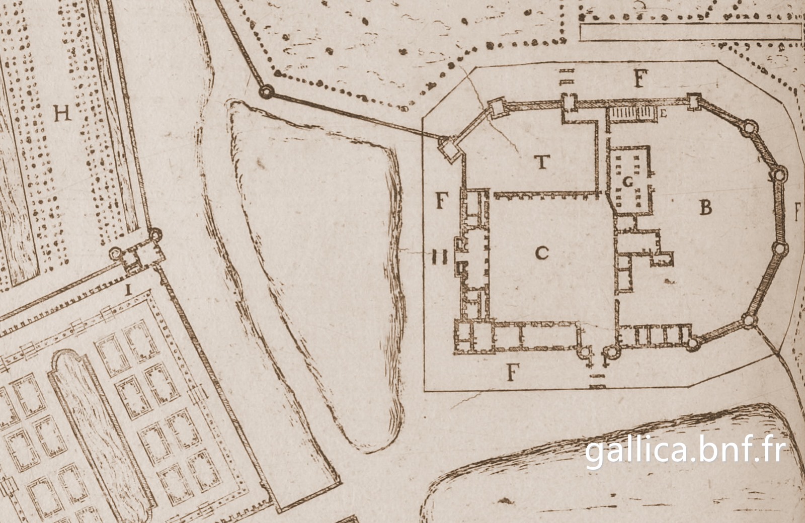 Ce pavillon a été suivi en partie sur celui du Louvre, non pas que ce soit la même ordonnance, ni aux enrichissements, ni aux commodités, mais pour ce qu'il n’y a rien que beau et bon. Pour le regard des aisances du dedans, vous les pouvez connaître par les plans, tant du premier que second étage, que je vous en ai dessiné. Et quant au reste du vieil château, avec partie du clos d’icelui, cela sert aujourd’hui de basse-cour. Le lieu est accompagné d’un parc, d’assez bonne grandeur, (ainsi qu’il se voit par le toisage des mesures du plan) clos et bien fermé. Joignant icelui est un autre clos, pareillement fermé, contenant dix-sept arpents, où sont de toutes sortes de plans de vignes, tant d’Orléans, Coucy, Beaune, Muscat, Anjou que tous autres des plus exquis.