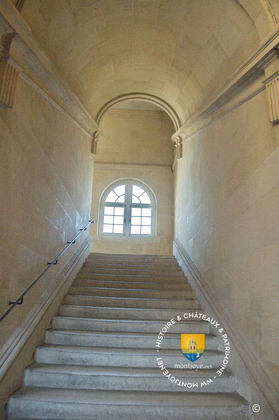 Les trois côtés de la cour, uniformes d’ailleurs, présentent chacun à leur centre un avant-corps d’ordonnance différente. Ce sont, à droite, deux ordres de colonnes isolées et superposées ; à gauche, un seul ordre de colonnes corinthiennes de grande dimension, embrassant la hauteur des deux étages ; au fond, en face de l’entrée, l’imitation en miniature d’un arc de triomphe antique. Les bâtiments n’ont qu’un étage sur rez-de-chaussée, mais au-dessus de chaque croisée se profile une lucarne d’un dessin élégant et correct. Sauf sur les avant-corps que nous avons décrits, les sculptures sont rares mais exécutées avec une perfection exquise.
