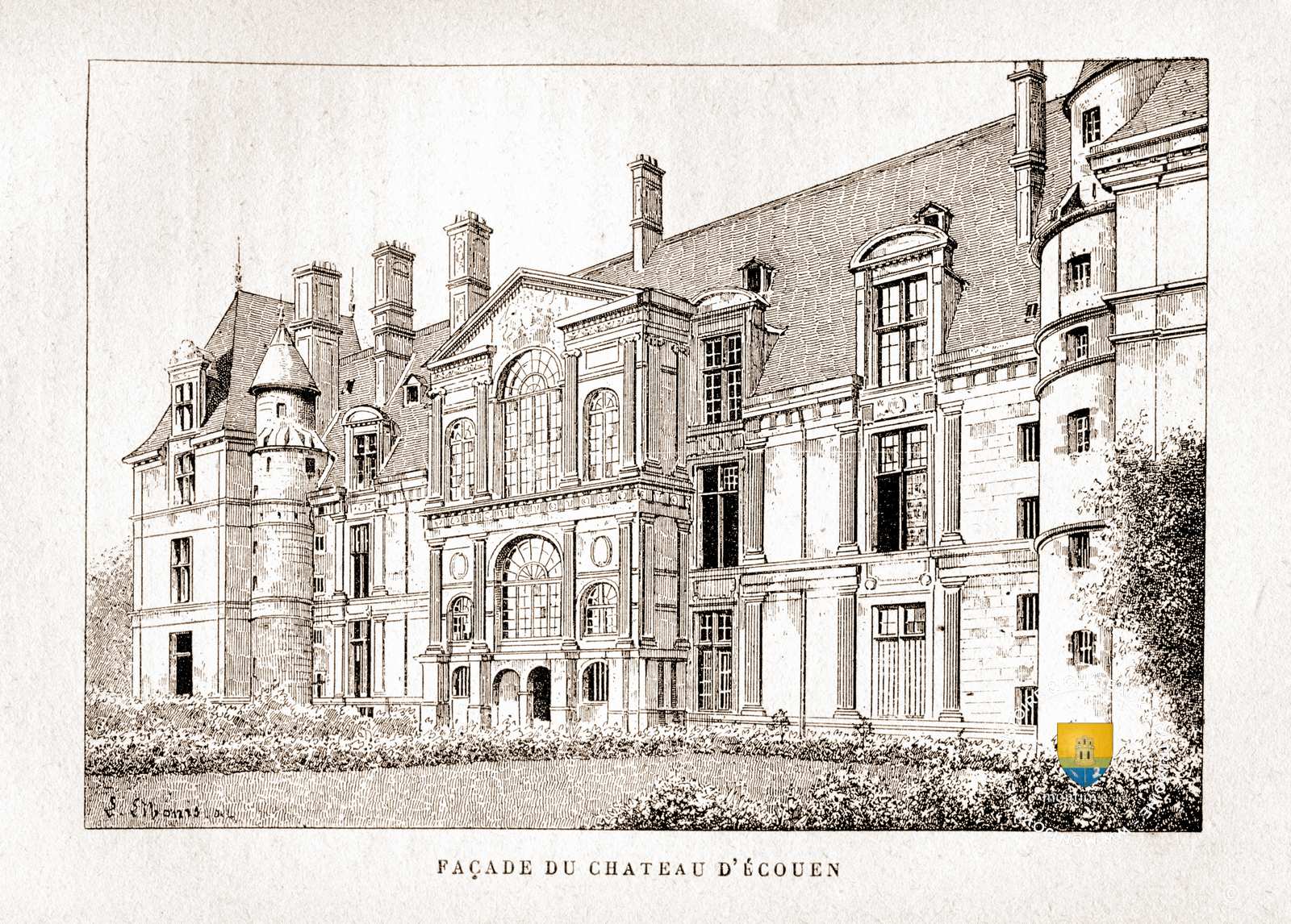 Ce beau palais fut bâti comme Chantilly par le connétable Anne de Montmorency, lorsque ce grand capitaine quitta la cour après le voyage de Charles- Quint en France. Il y vécut dans la retraite, mettant ses immenses richesses au service de son goût pour les beaux-arts, conservant aussi d’étroites relations avec l’héritier présomptif de la couronne, le dauphin Henri. C’est là, dit-on, que ce prince obtint les premiers rendez-vous de la belle Diane de Poitiers dont les croissants figurent dans toutes les sculptures du château. Le connétable favorisait cette intrigue dont il devait si bien profiter quelques années plus tard, grâce à son influence sur la favorite, et prêtait complaisamment son château à l’amoureux Henri dont la passion s’avivait par le mystère. D’après Brantôme, une fille serait née à Ecouen de cette liaison, et Henri ayant voulu la légitimer, Diane s’y serait opposée avec fierté : « J’étais née pour avoir des enfants légitimes de vous; j’ai été votre maîtresse parce que je vous aimais, je ne souffrirais pas qu’un arrêt me déclarât votre concubine. » La réponse est orgueilleuse, le caractère de Diane la rend vraisemblable.