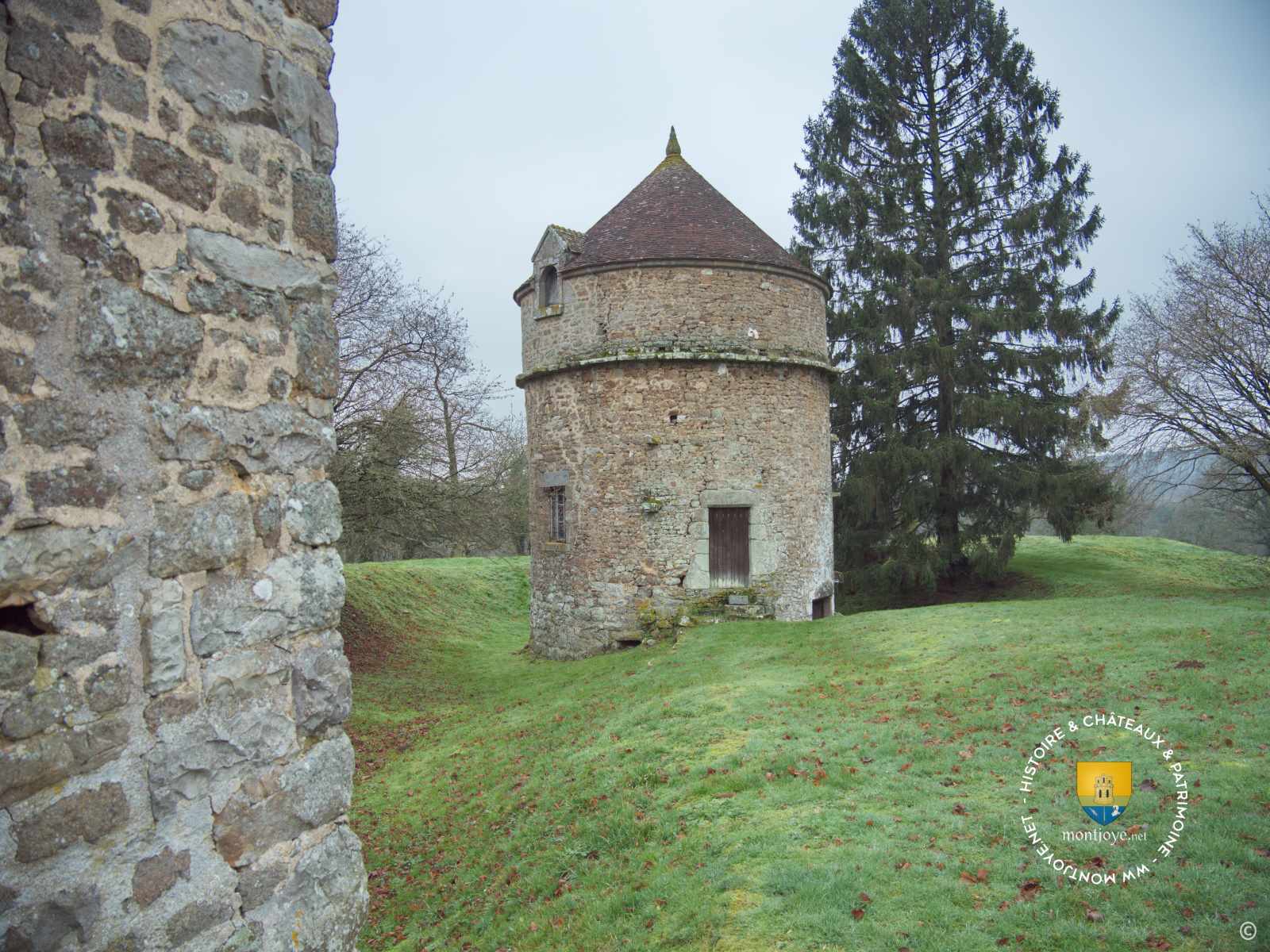 C'est probablement à Guyon d'Essirard à qui on doit le château actuel, néanmoins il existait un logis probablement fortifié mais dont l'aspect de l'ensemble reste à déterminer. Il est assez étonnant de voir une construction médiévale aussi rustique, malgré les conforts de cheminée dans deux salles, à une époque aussi lointaine de la guerre de Cent-Ans. Si il n'est pas rare de voir des constructions de type médiévale à la fin du XVe, voir même au XVIe, il est assez rare qu'elles reprennent l'aspects de fortifications du XIVe, voir du XIIIe. Il est donc possible que la tour actuelle soit reconstruite sur une ancienne tour défensive, le sous bassement de la tour est différente du parement supérieur. La tour de guet possède également un cellier. Le colombier est en réalité une ancienne tour de défense transformée comme pigeonnier.