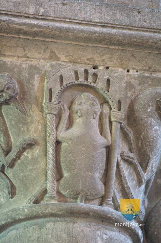 Les autres mystères se trouvent dans certaines colonnes ornées de crapauds ou monstres, qui ne semblent pas de la même époque, il pourrait s’agir de rajout d’anciennes églises. Le plus important ornement semble être le « crapaud » de Clovis. Je mets crapaud entre guillemets, parce que même si la forme semble être un crapaud vu du dessus, je n’en ai jamais vu avec des oreilles… Il semble donc difficile de reconnaître un animal quelconque. Il s’agirait plutôt là de voir en cet animal une créature diabolique dont l’origine est inconnue. Ce monstre d’un autre âge était peut-être l’emblème de Clovis, ils étaient au nombre de trois et remplacés plus tard pendant sa conversion au christianisme en fleur de lys.