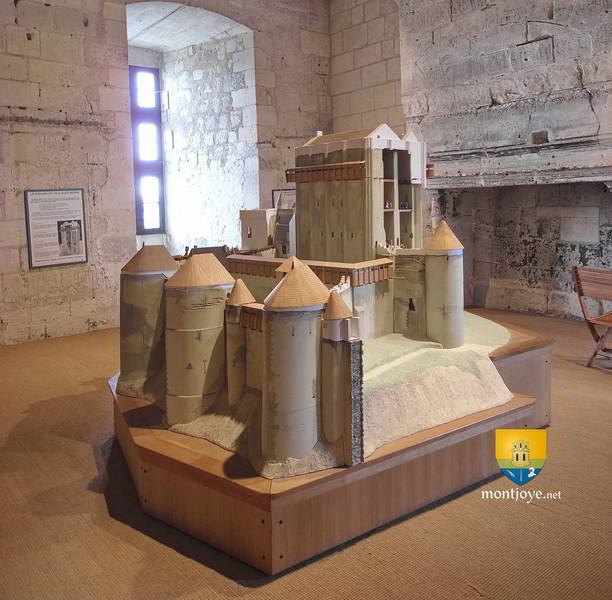 La photo du haut représente une maquette de la fortification du Donjon au XIIIe, selon une étude de Jean Mesqui.