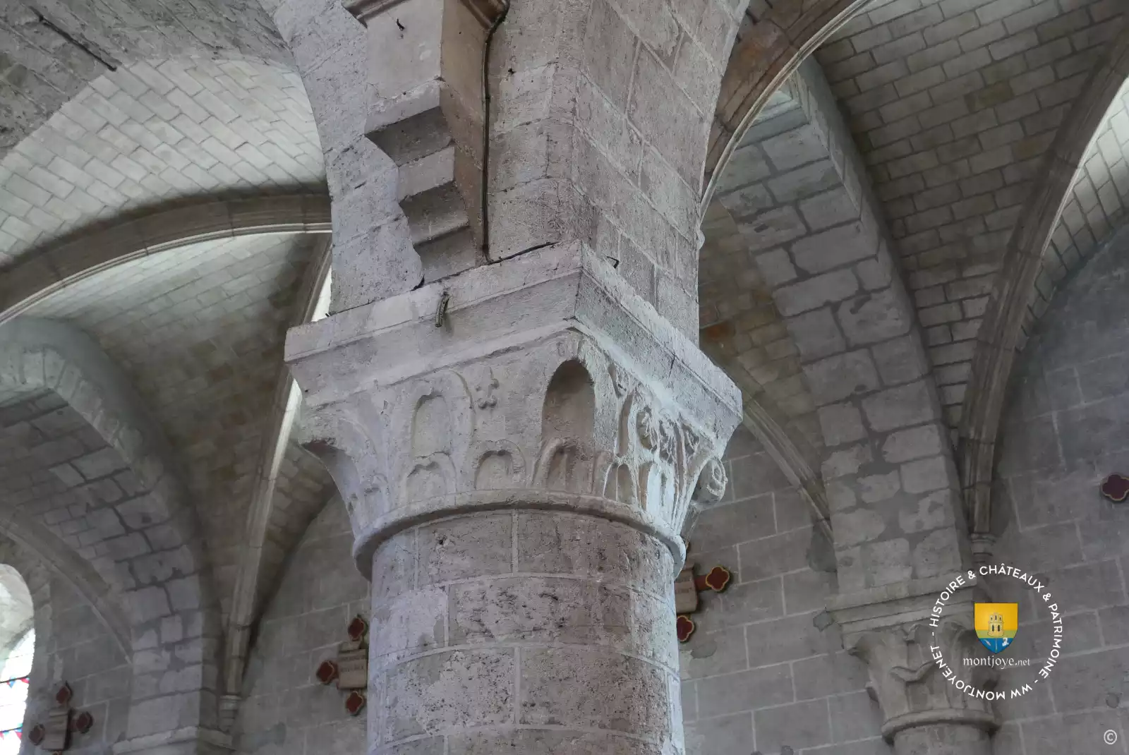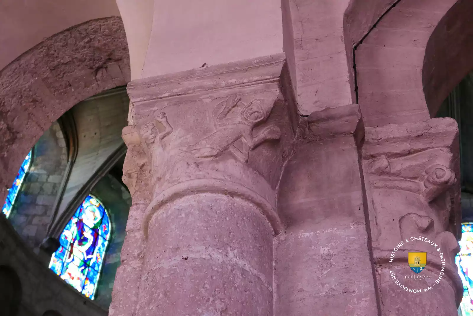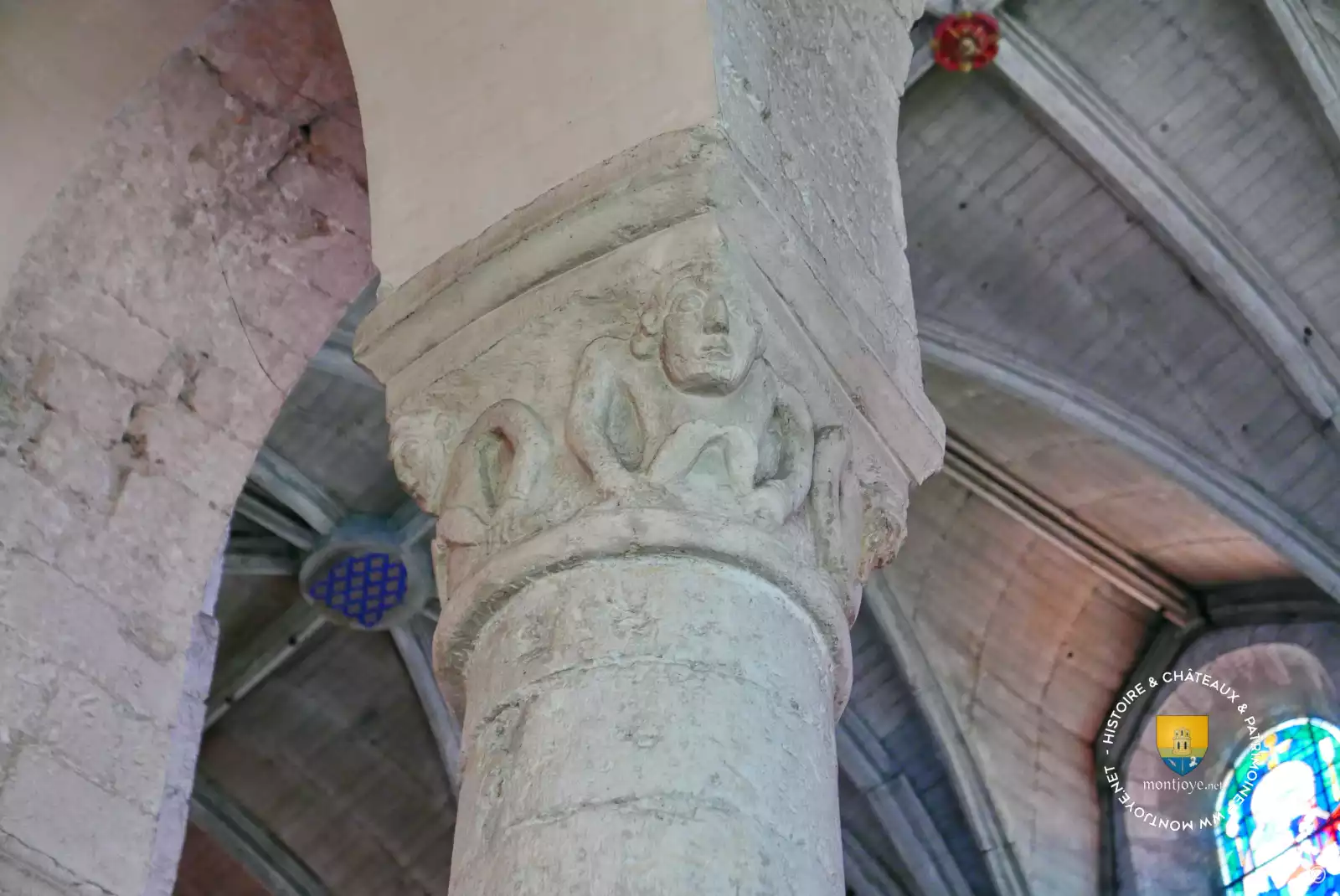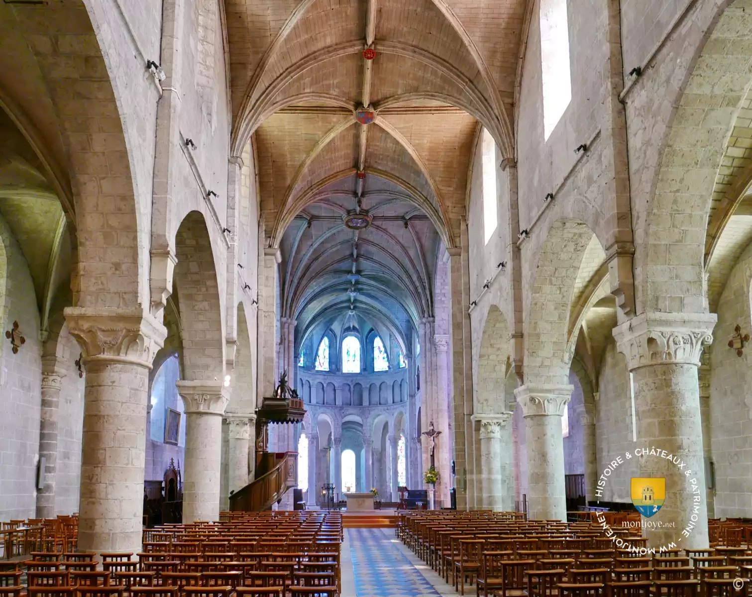 La voûte lambrissée imitant une voûte de pierre fut mise en place en 1665. Les médaillons rappellent les grandes dates de l'abbatiale. Les chapiteaux romans dont la représentation du combat entre David et Goliath, le Phénix, la mitre d'Evêque , fleurs de Lys et d'autres. Même si les détails ne sont pas très raffinés, leur nombre et les représentations ( lys notamment ) sont typiques de l'époque mais leur grand nombre pour une église romane est assez rare.