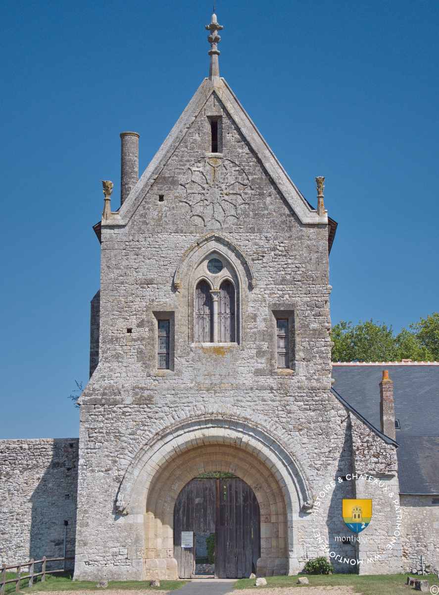 La façade du portail présente une ornementation soignée. Selon la tradition, les visages qui reçoivent l'arc sculpté surmontant la baie brisée de l'étage représenteraient, à droite, Hugues des Roches, et à gauche, Étienne de Mortagne. Au-dessus, le décor de fausse vitrerie évoque les rosaces de l'architecture religieuse.