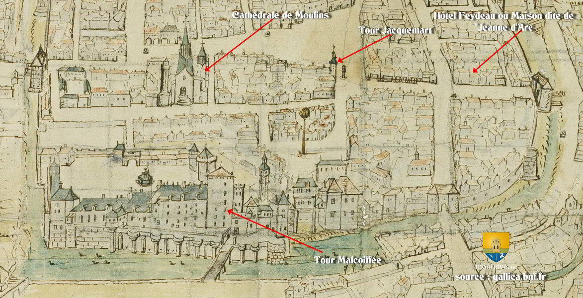 La difficulté d’attribuer la maison à celle que Jeanne d’Arc proviens du fait qu’on n’a pas le nom chez qui elle logea à Moulins, à la différence par exemple d’Orléans et Poitiers. L’autre difficulté c’est que la source est une légende locale, dont je n’arrive pas pour l’instant à trouver son origine et datation. De plus les maisons du XVe siècle à Moulins sont encore très nombreuses, même si la majorité date de la fin du XVe et pas du début du siècle. Par ailleurs Moulins subit un incendie majeur le 20 novembre 1655 détruisant une partie de la ville par le feu.