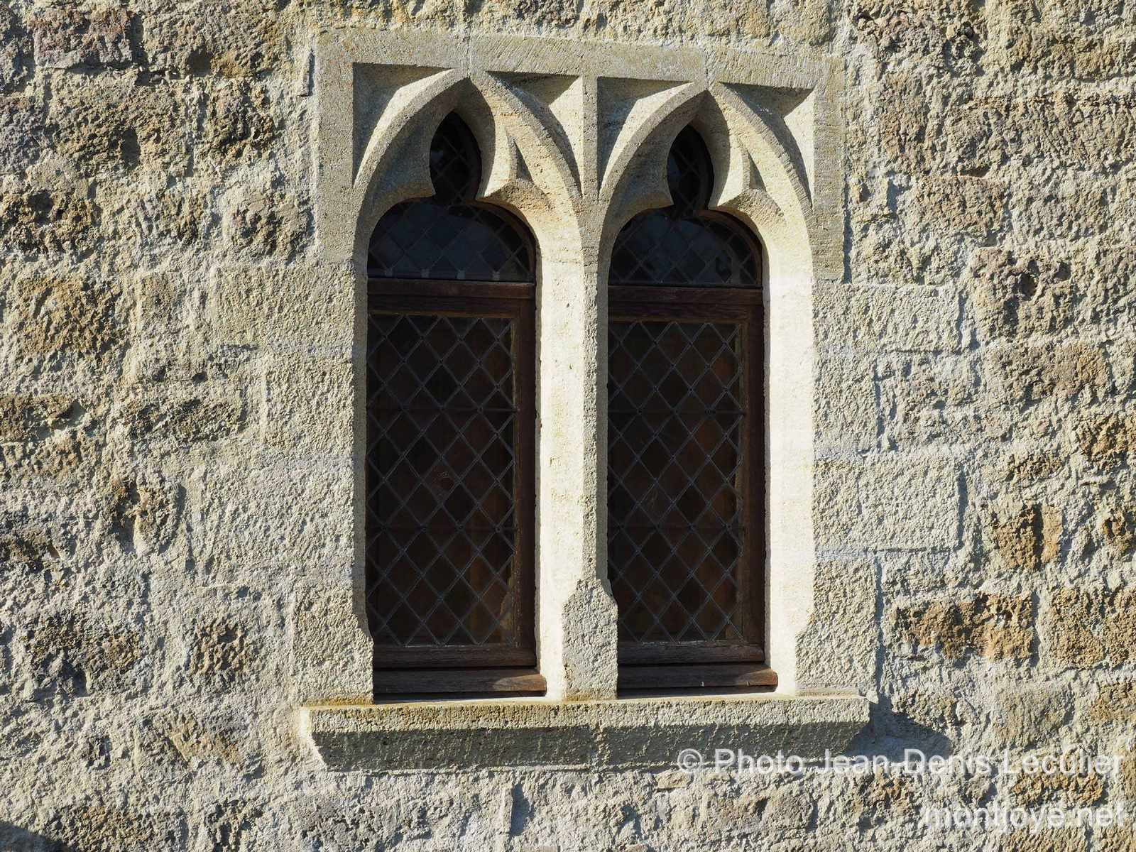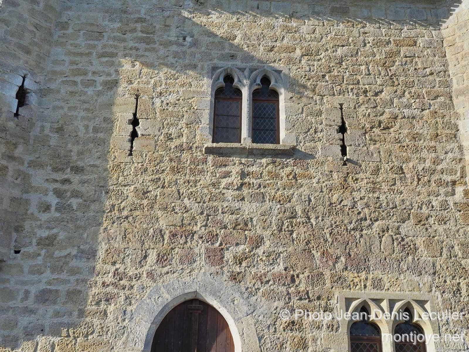 On entre dans le rez-de-chaussée par deux portes ogivales, l'une au levant, l'autre au couchant; cette salle est, en outre, éclairée par six meurtrières assez larges. Les étages supérieurs sont garnis de meurtrières en croix, et, de plus, éclairés par des fenêtres géminées, subtrilobées et renfermées dans un riche encadrement rectangulaire, les échauguettes sont également garnies de meurtrières.