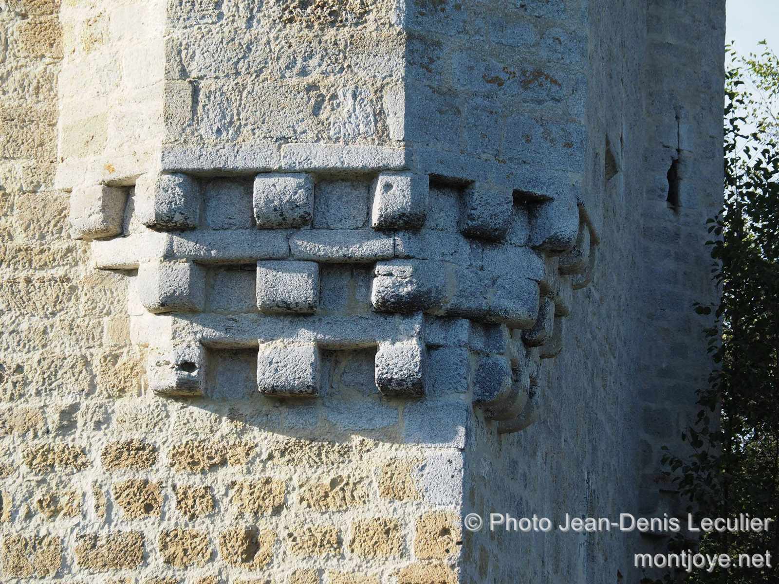 On voit encore, à l'intérieur, des corbeaux destinés à appuyer les poutres du plancher ou les jambettes de la charpente; d'autres corbeaux, à l'extérieur, ont peut-être servi à établir des hourds, et alors le couronnement aurait eu des créneaux, mais pas de mâchicoulis.