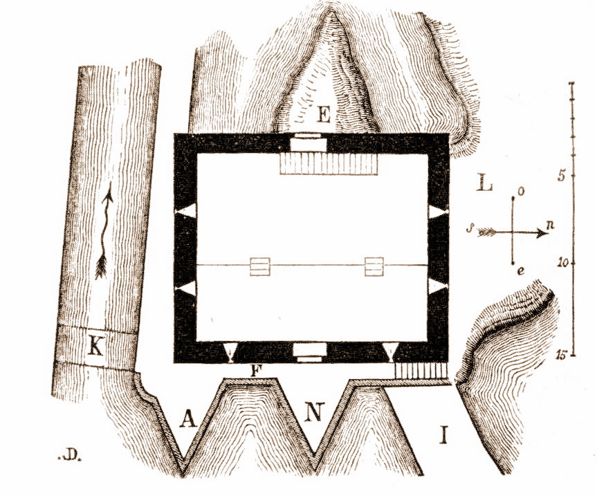 Primitivement, l'accès de ces portes était fort difficile, et le serait encore si le pont K n'existait pas. Pour arriver jusqu'à elles, il fallait traverser un large bras du Dropt au sud, ou le Dropt lui-même au nord. Si l'on prenait la première route, on ne pouvait, après avoir traversé le bras de la rivière, parvenir à la porte E qu'en passant sous les défenses supérieures, et si l'on s'éloignait des murs, on recevait les flèches et carreaux lancés des meurtrières. La difficulté était la même si l'on choisissait la porte orientale; mais, comme il fallait passer près des murs, il est fort probable que le pont F était en bois au lieu d'être en pierre, et pouvait être facilement enlevé. Si l'on prenait la seconde route, il fallait traverser la rivière, puis s'établir sur une petite île (L) au nord du moulin, et de là les mêmes difficultés que celles signalées plus haut se présentaient pour arriver aux portes. Le petit escalier placé extérieurement contre l'angle nord-est sert à passer sur l'île. Un autre escalier, dans l'intérieur, conduit au premier étage. Tous deux me paraissent modernes.