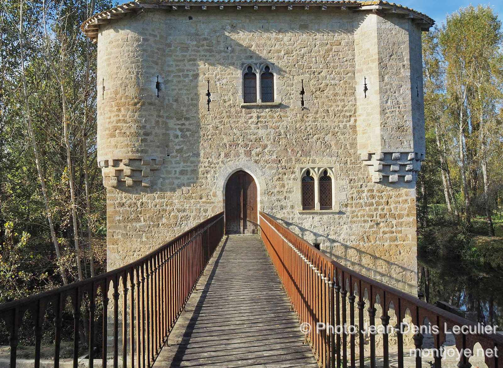 On entre dans le premier étage par une porte ogivale percée au sud au bout d'un pont en bois qui traverse un bras du Drot converti en prise d'eau. On arrive au rez-de-chaussée par un pont-levis (K)qui traverse l'écluse.