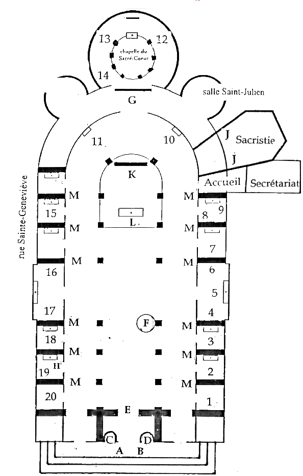 la rigueur du plan : nef de trois travées, transept non saillant, choeur de deux travées droites terminé en hémicycle, bas-côtés continus bordés de chapelles latérales la sobriété des élévations : grandes arcades en plein cintre, moulurées, sans agrafes ;