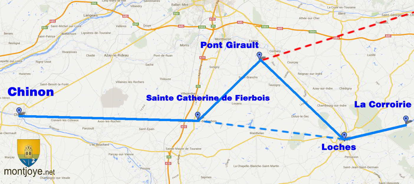 Trait bleu continu serait le passage de Loches vers le Pont Girault et Sainte-Catherine de Fierbois, le trait bleu en pointillé le passage supposé originel et logique, le trait pointillé en rouge serait l'autre probabilité si elle était passée par le Pont Girault, mais les historiens semblent plutôt accréditer un passage à Loches. On peut voir que le trajet serait entre Loches - Pont Girault - Sainte-Catherine de Fierbois de 40 km minimum et de 30 km entre Loches et Sainte-Catherine de Fierbois soit une journée de cheval pour ce dernier, il parait difficilement concevable ce détour sans élément historique qui le confirmerait d'autant que l'époque n'est pas propice à des détours inutiles ( problème de sécurité notamment ).