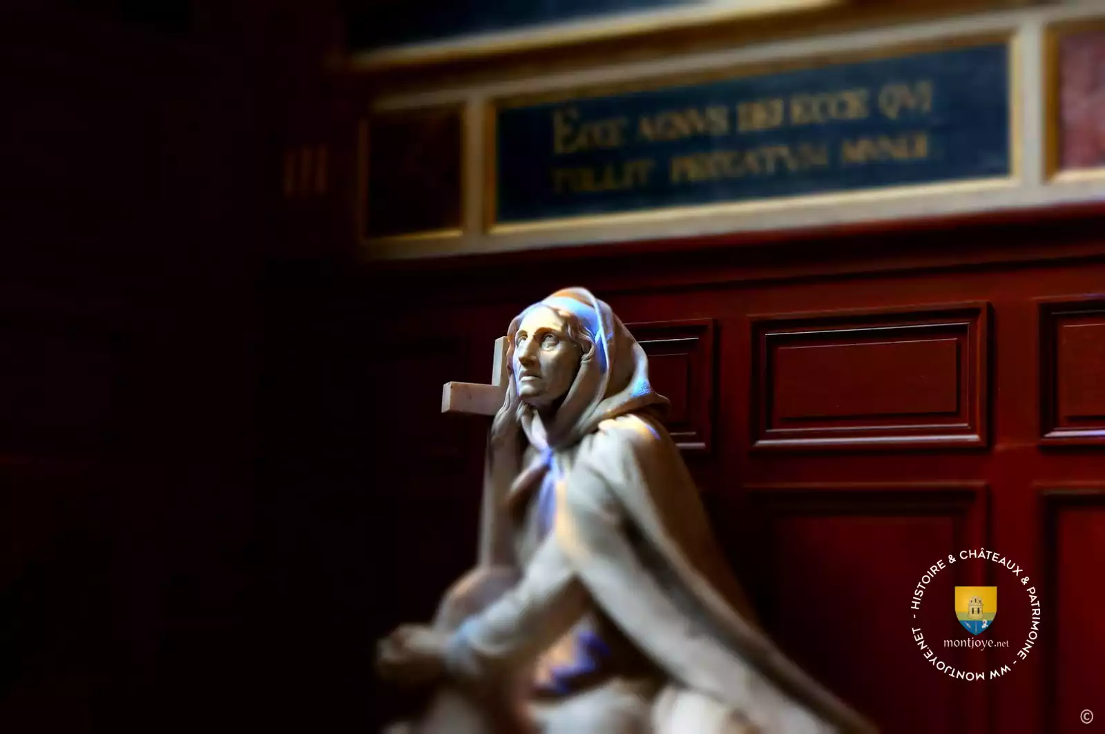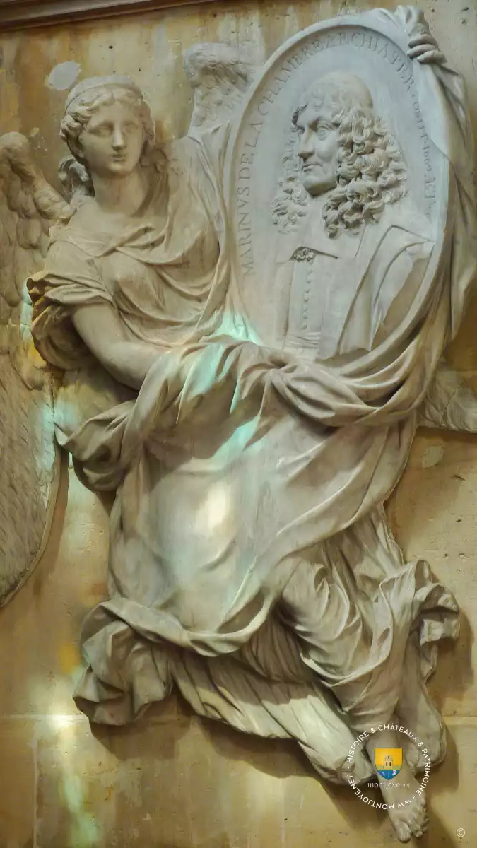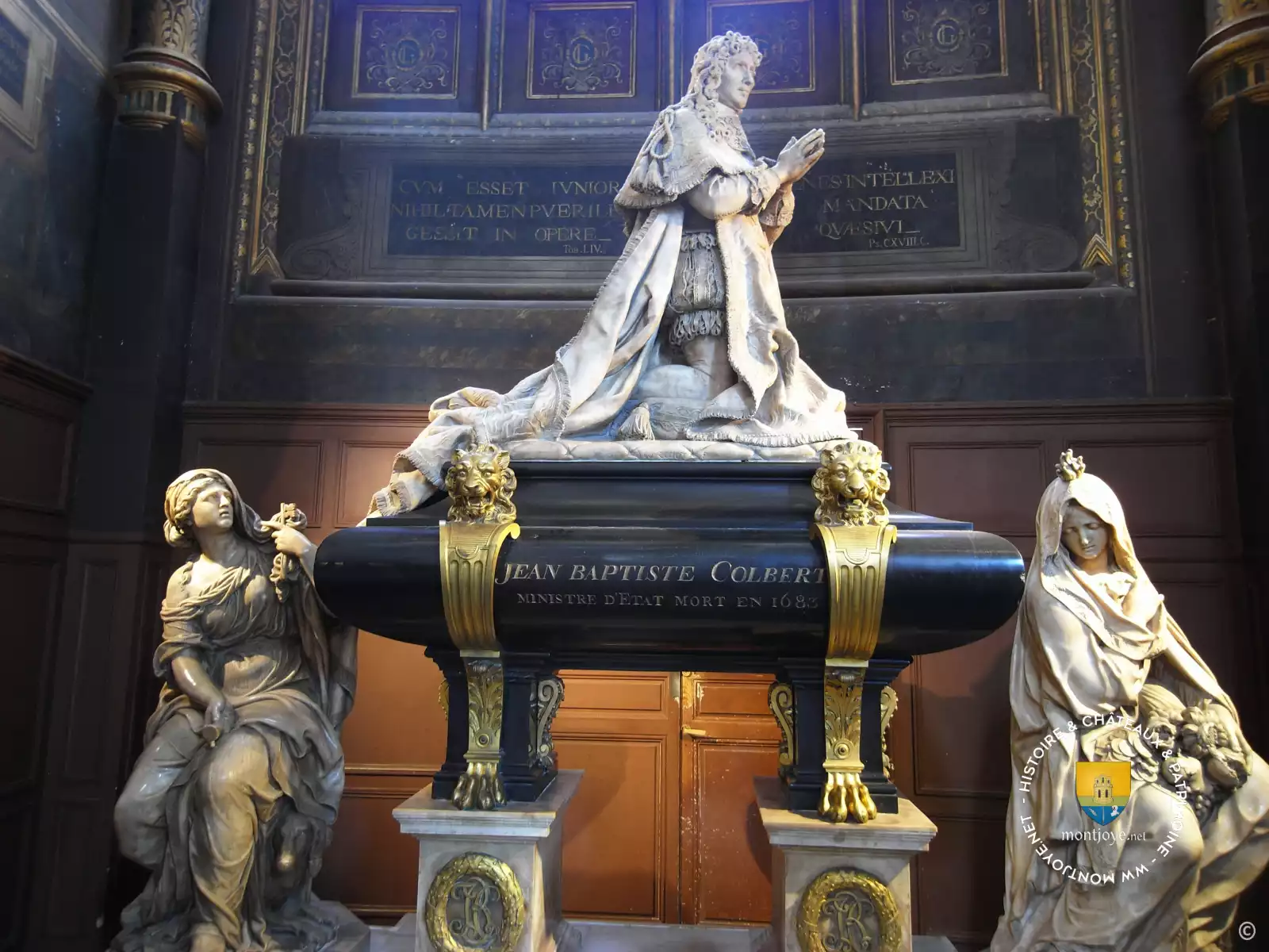 Le mausolée de Colbert, par Coysevox. Le ministre est représenté ici revêtu du costume de l’Ordre du Saint-Esprit, l’épée au côté gauche, dans l’attitude de la prière : les mains jointes, longues et fines, sont admirables, le visage est d’une gravité sereine. De chaque côté du monument, une statue de femme assise : à gauche, la Fidélité ; à droite, l’Abondance.