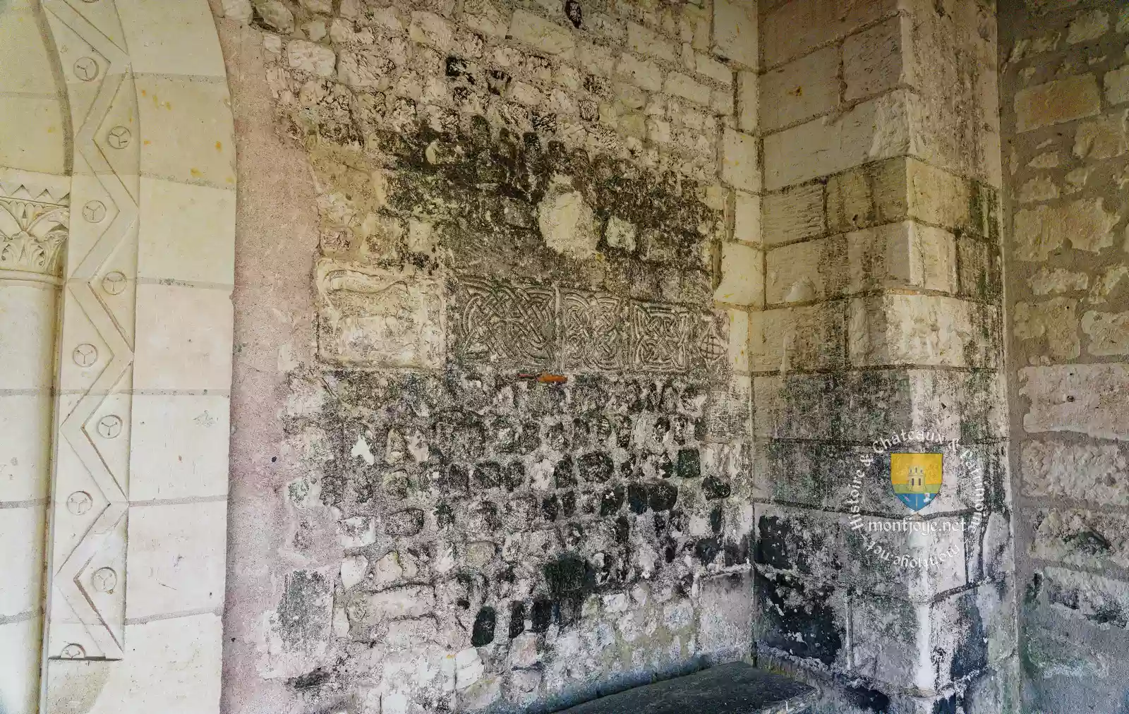Les éléments de décoration observés sur une portion de mur semblent être des remplois provenant d'un ou plusieurs édifices antérieurs. Cette portion de mur est construite en petit appareil avec l'ajout d'un moyen appareil à joints épais. Il est discutable de considérer le moyen appareil comme une reprise du XIe siècle, tandis que les métopes sont clairement des éléments réutilisés, comprenant des motifs disparates tels que des entrelacs et des palmettes. Ces éléments restent difficiles à dater avec précision, bien que des savants aient avancé des hypothèses allant du VIe au Xe siècle. Le clocher, quant à lui, date clairement de la première moitié du XIIe siècle et est renforcé de contreforts d'angles. Il comporte une tourelle d'escalier en saillie contre le mur du chœur, et est éclairé par des fenêtres à baies géminées ornées de colonnes et de chapiteaux sculptés.