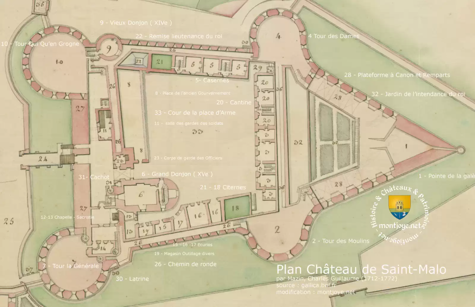Plan du château de Saint-Malo au XVIIIe siècle, certains bâtiments ont disparus comme les parties : 19-15-17-16-16-18. On est sur une fortification défensive très massive, surtout au niveau des tours Qui qu'en Grogne et la Générale, le vieux donjon parait bien petit par rapport à l'ensemble.