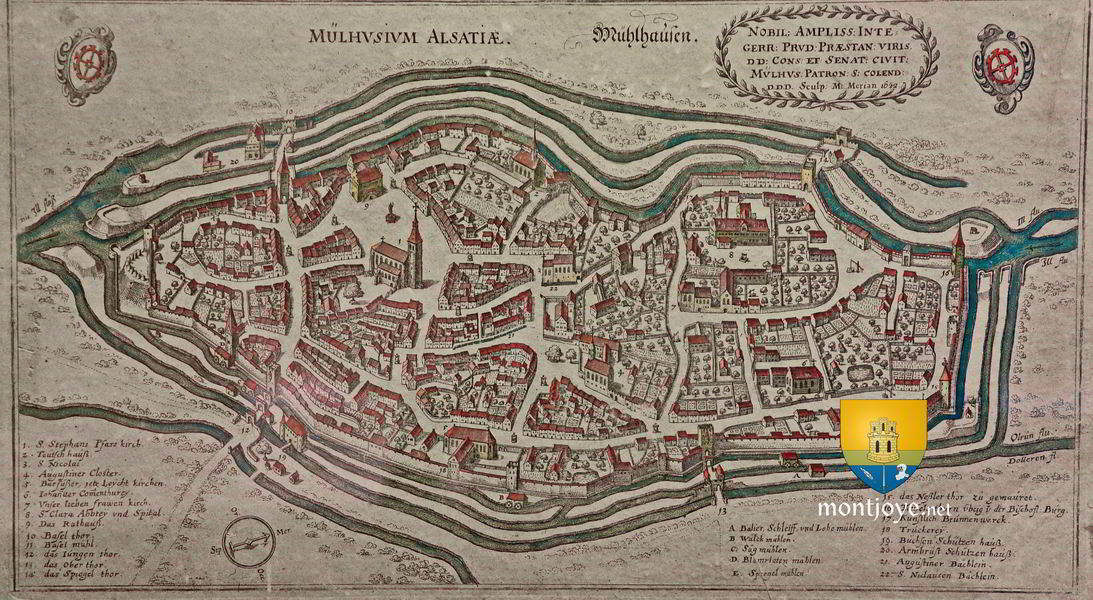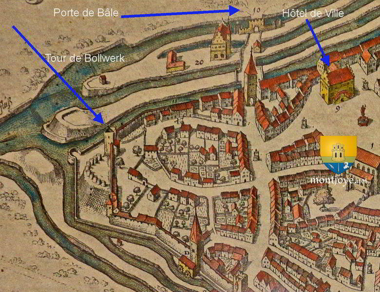 Carte de Mulhouse en 1642 ( détail ), on voit nettement la tour Bollwerk et l'Hôtel de Ville de Mulhouse